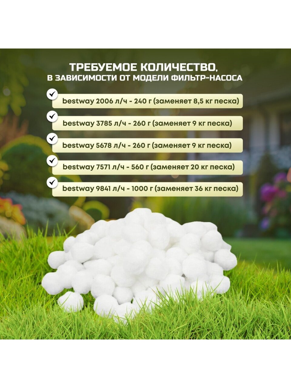 Этот наполнитель изготовлен из полиэтилена и поставляется в удобной упаковке весом 500 грамм, что делает его легким и простым в использовании. В комплекте предусмотрен сетчатый мешок для чистки, который еще больше упрощает процесс обслуживания. Продукт произведен под брендом Bestway, который известен своим качеством и надежностью.