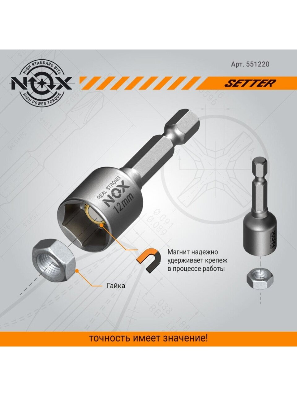 Ключ-насадка магнитная Nox используется совместно с шуруповертами для ввинчивания кровельных саморезов и закручивания гаек.