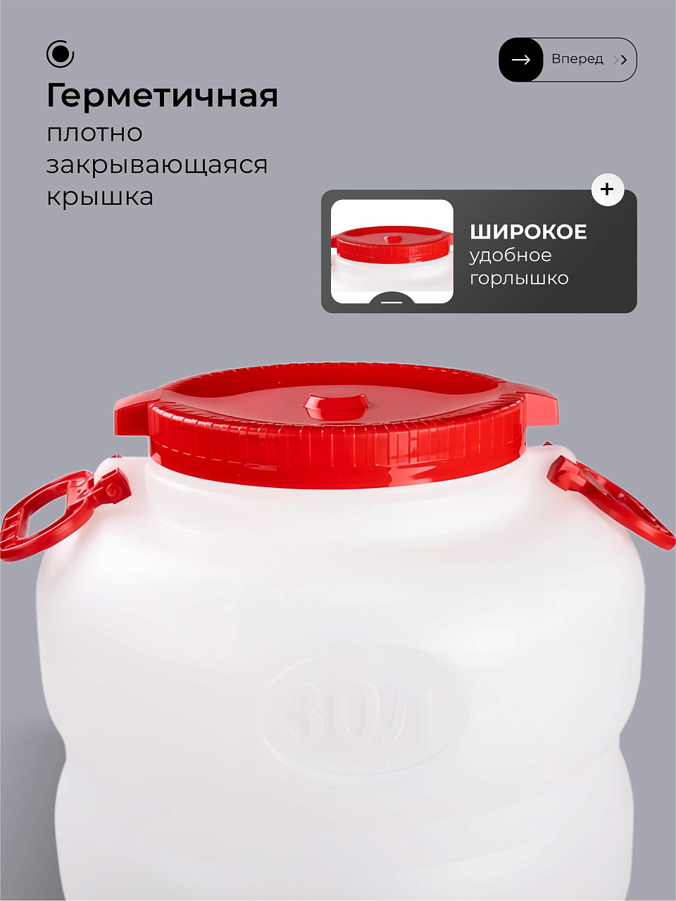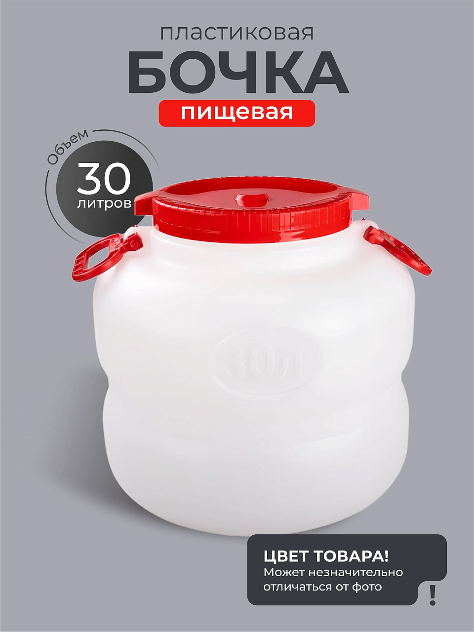 Бочка пластиковая 30 л для пищевых продуктов: легкая, прочная, с ручками, подходит для воды, хранения и перевозки. Выгодно купить для дачи и дома.
