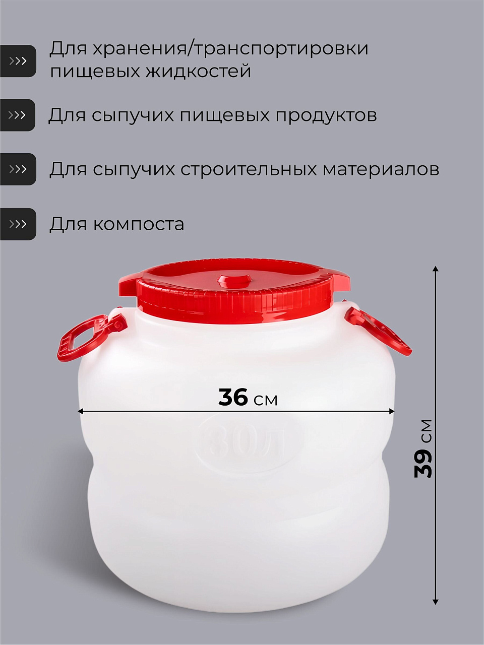 Да, благодаря объему 30 л и прочным ручкам, бочка удобна для воды, солений, компота, сыпучих продуктов — легко переносить и мыть.