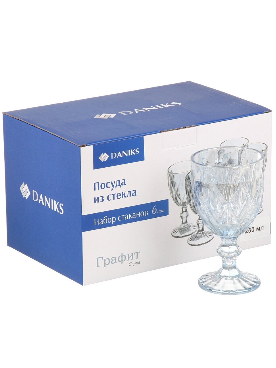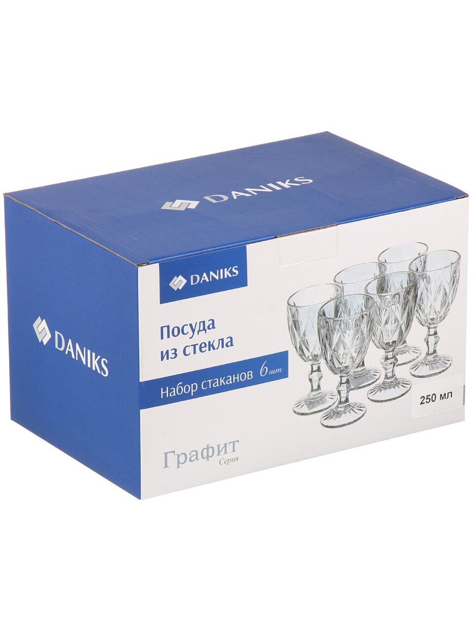Объём каждого бокала — 250 мл, форма — коническая, материал — рельефное прессованное стекло, цвет — графитовый (серый).