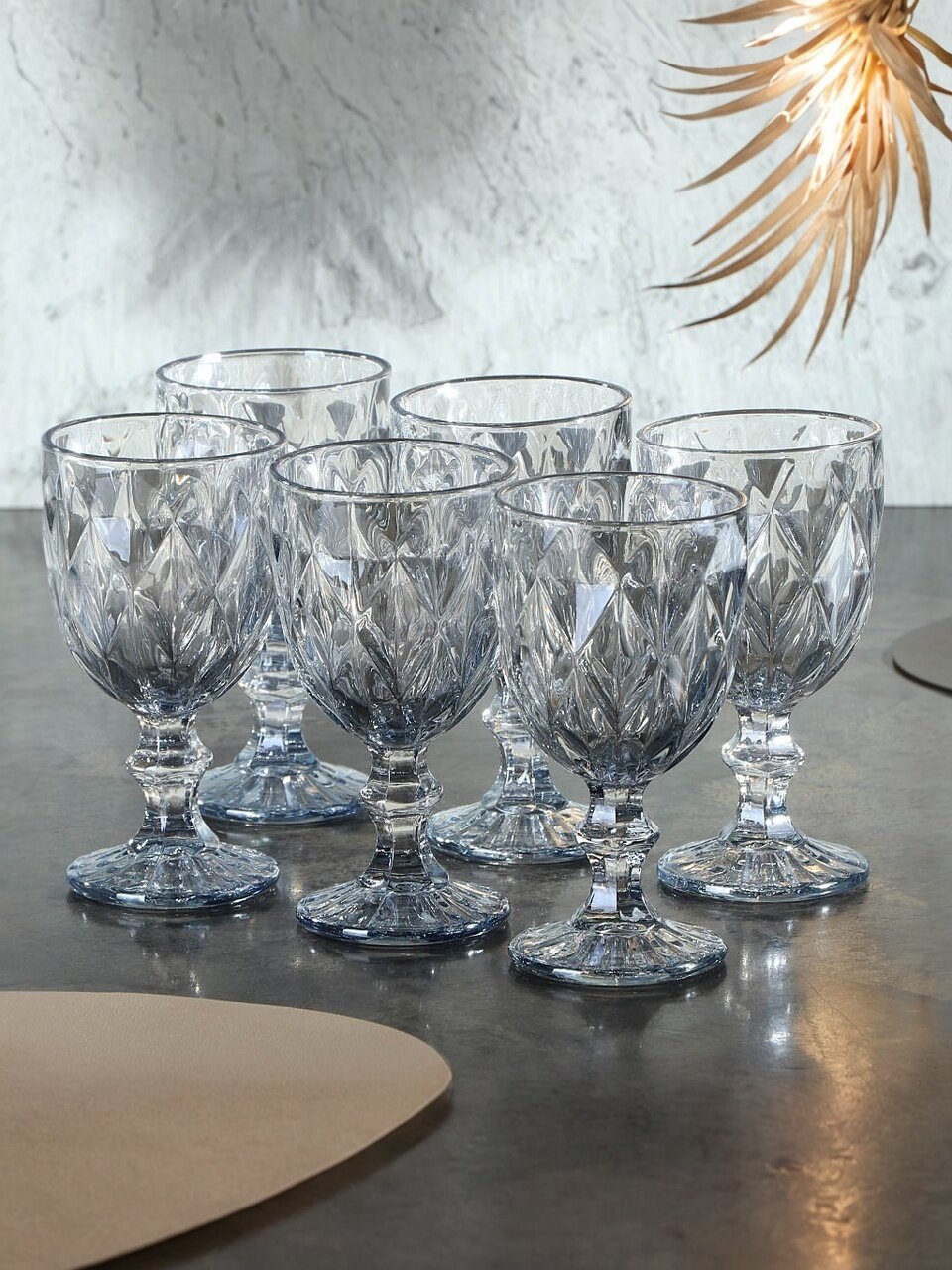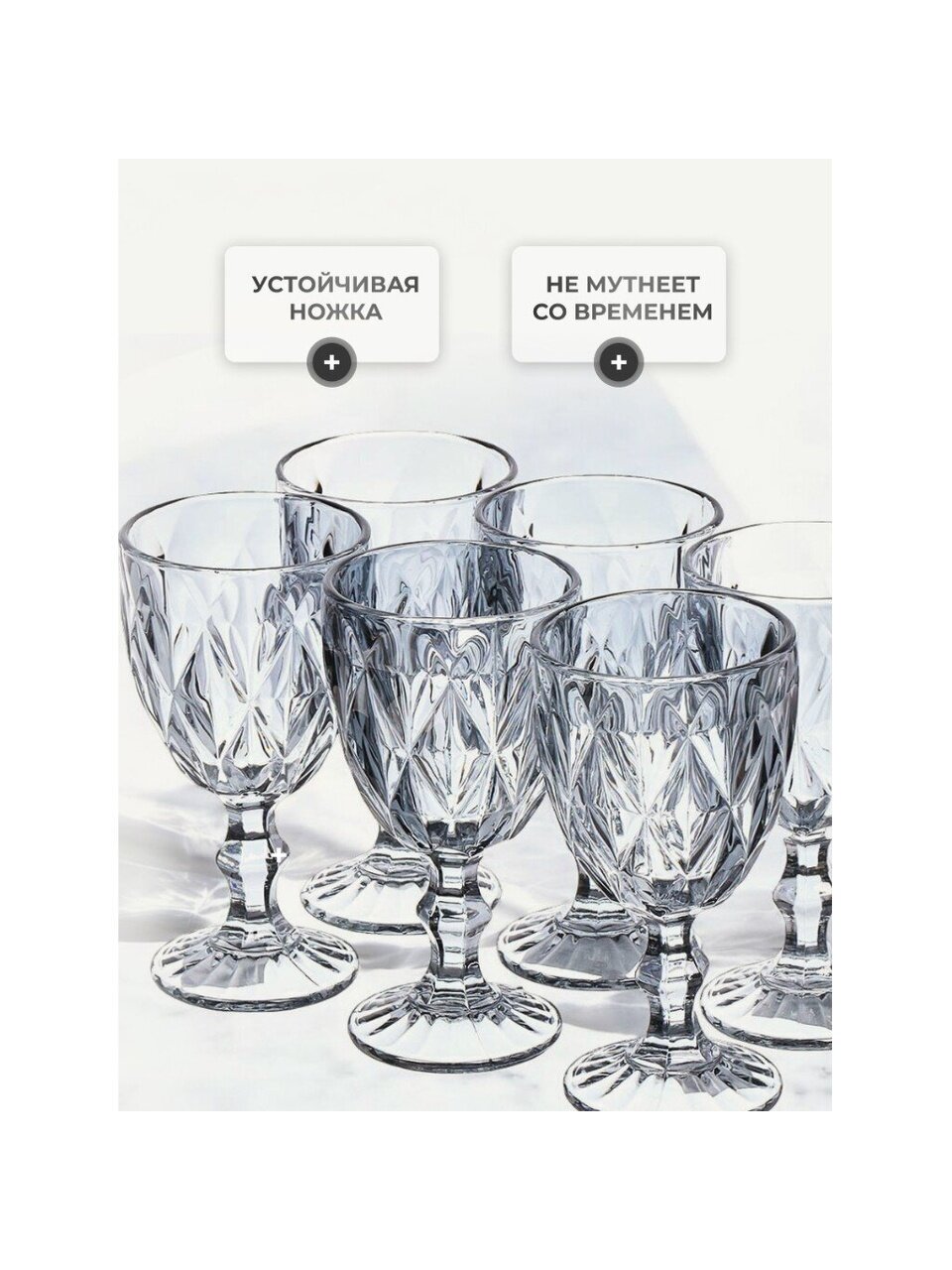 - Современный дымчатый дизайн — рельефная текстура и узор делают бокалы акцентом на любом столе