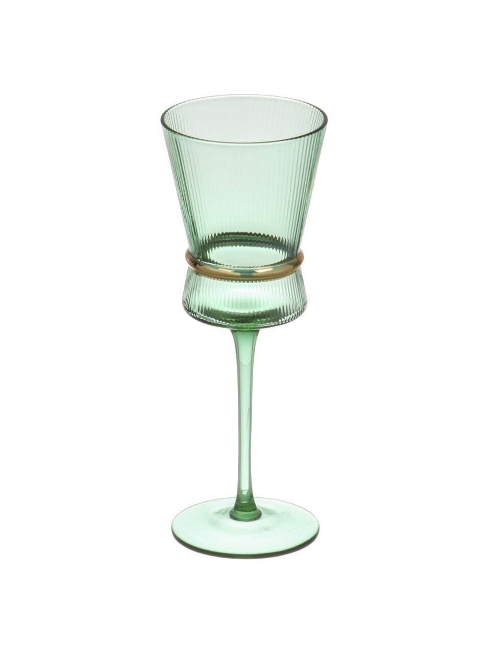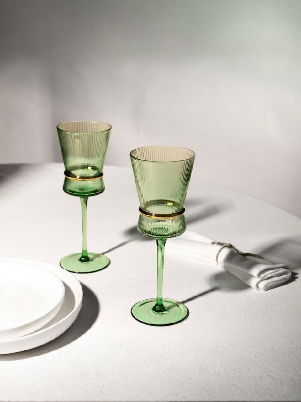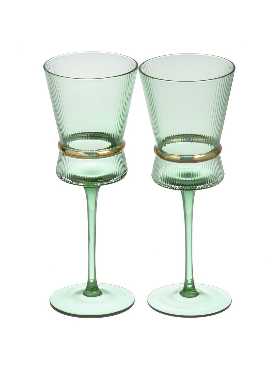 Объем каждого бокала — 320 мл, материал — прессованное стекло, форма — коническая, цвет — зеленый, дизайн — рельефный узор.