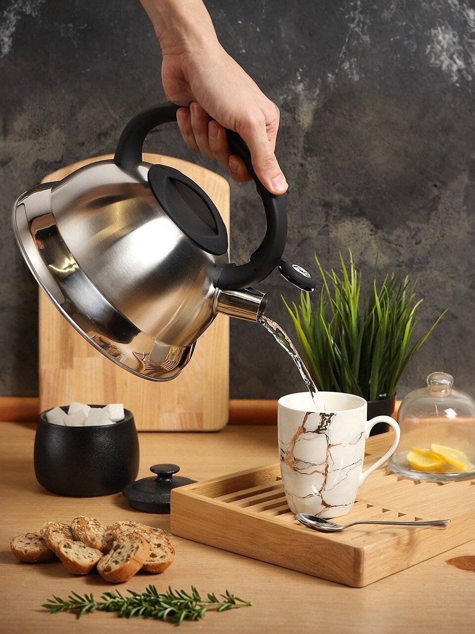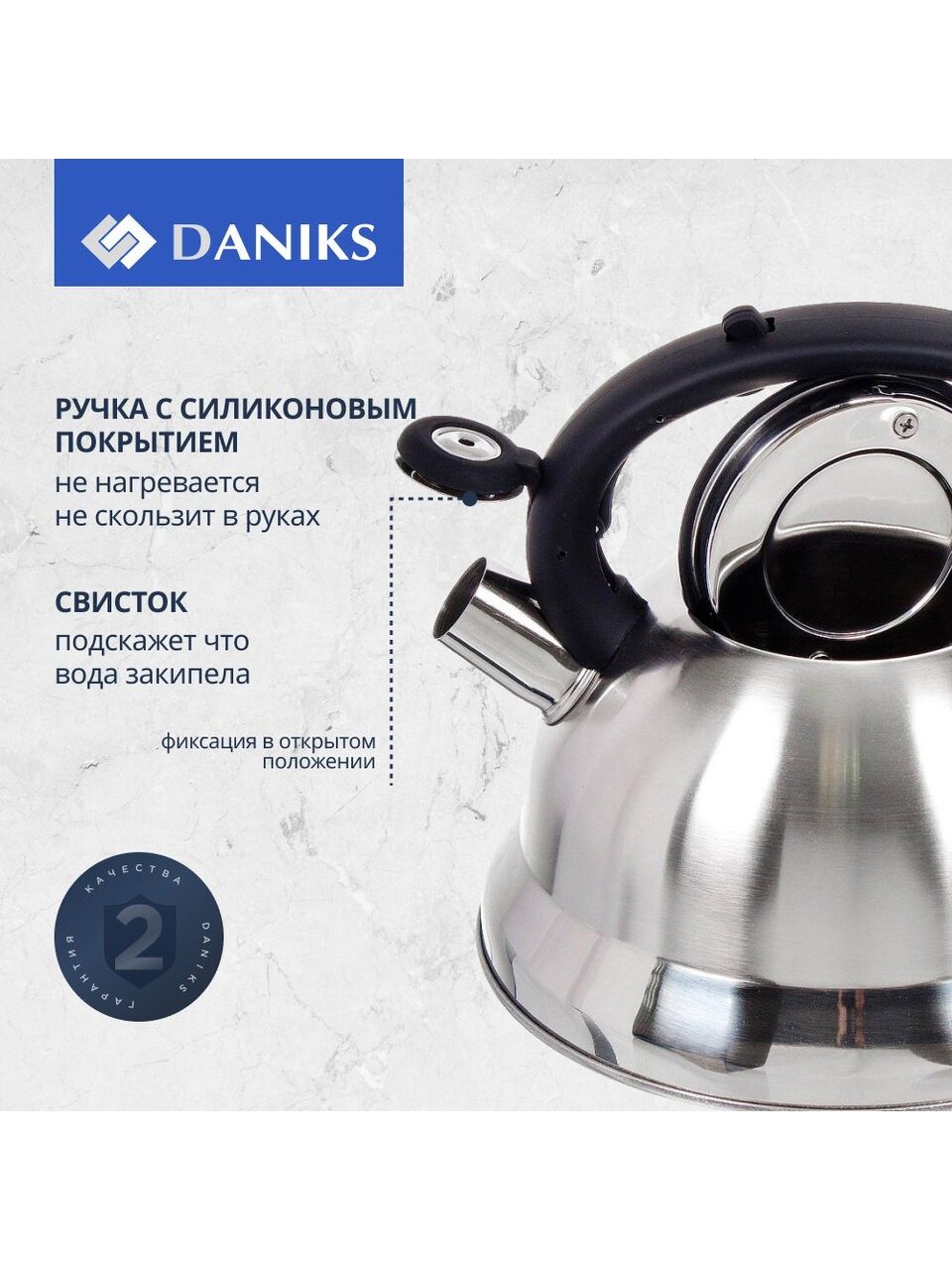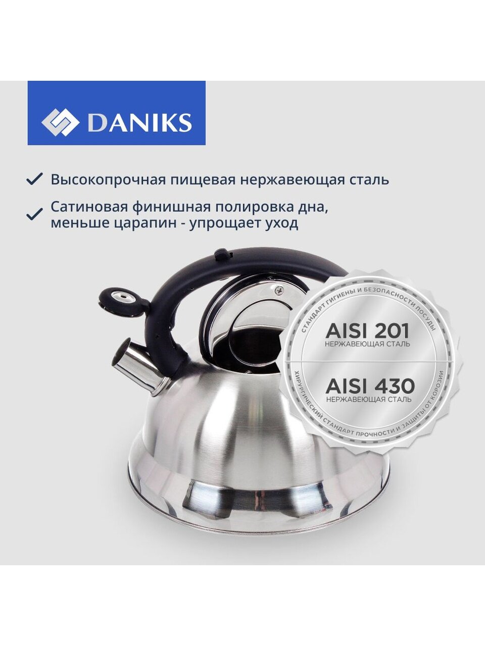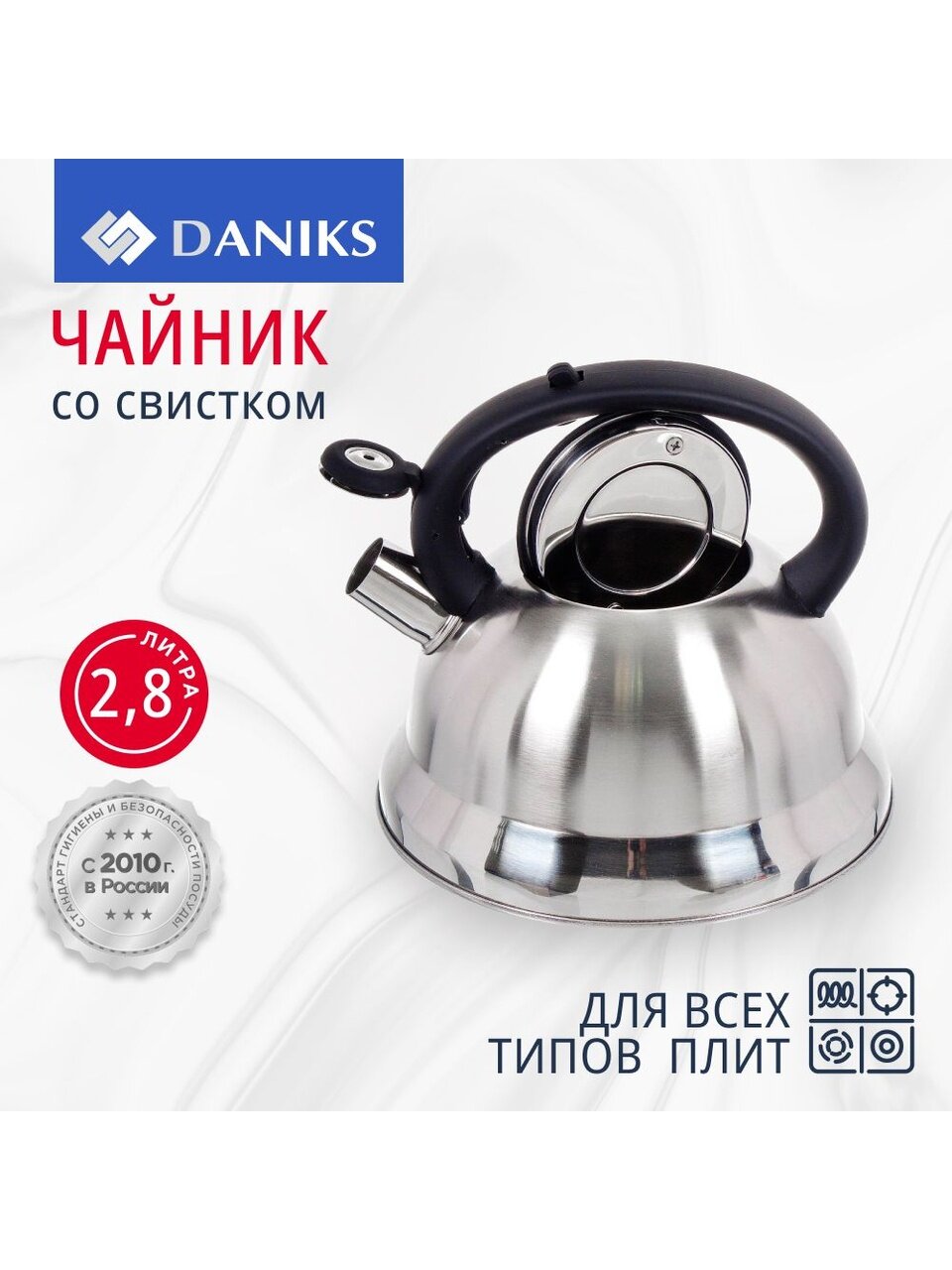 Вы можете приобрести «Чайник нержавеющая сталь, 2.8 л, со свистком, матовый, ручка с силиконовым покрытием, Daniks, MSY-013» и другие товары в нашем интернет-магазине в Курске по низким ценам и с бесплатным самовывозом.