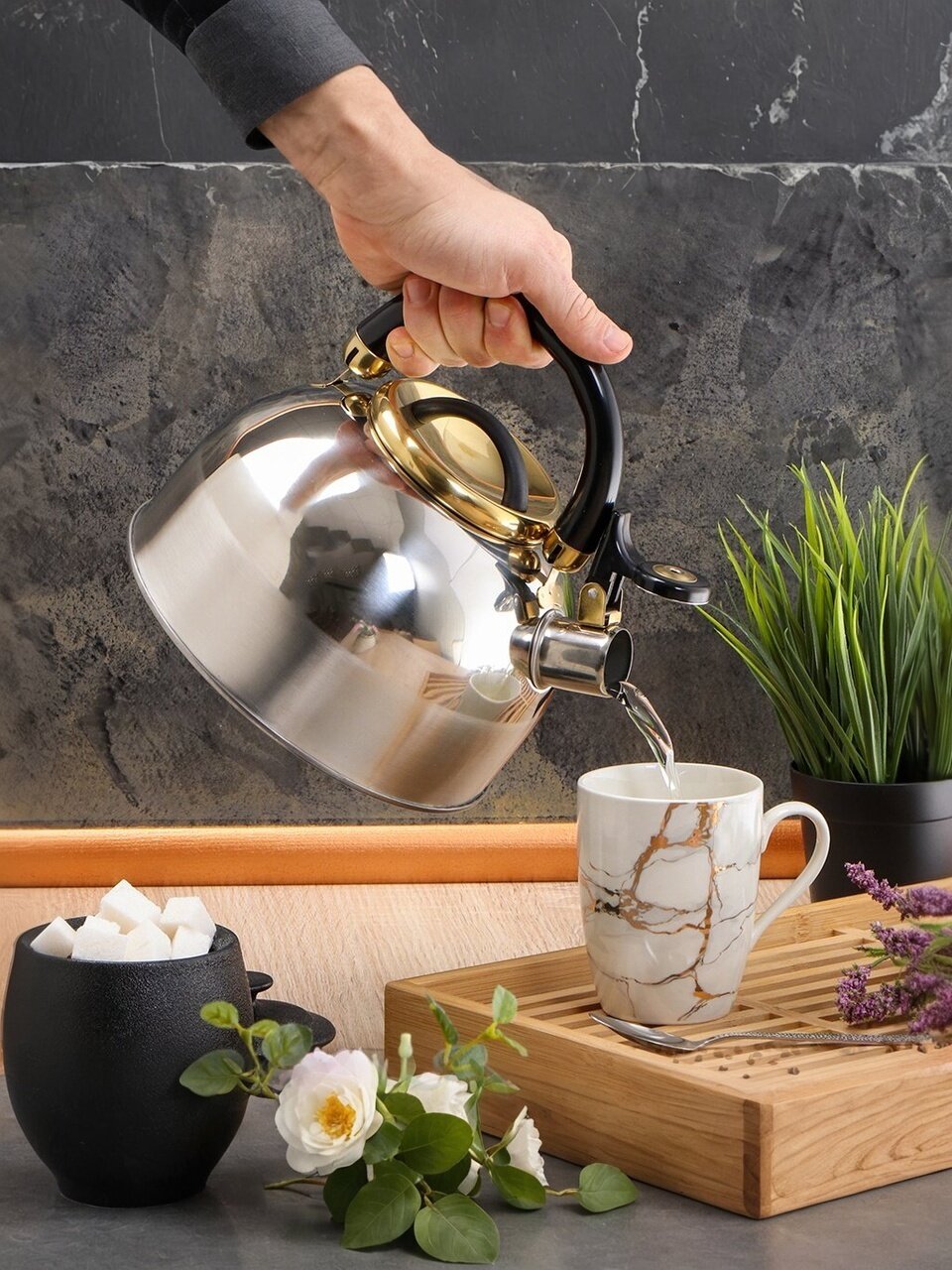 - Зеркальная полировка и свисток: стильный внешний вид и контроль закипания без лишних усилий