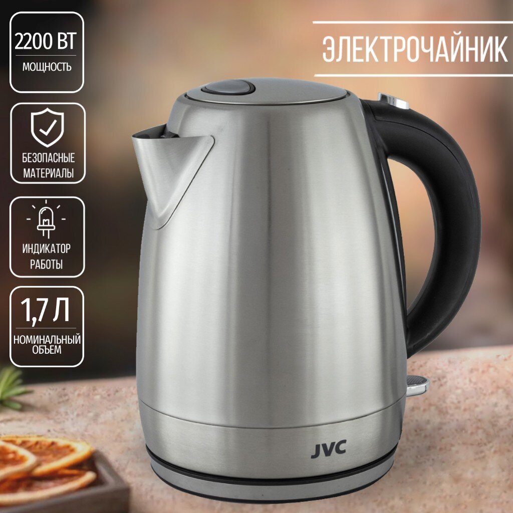 Чайник электрический JVC, JK-KE1719, 1.7 л, 2200 Вт, скрытый нагревательный элемент, нержавеющая сталь, пластик