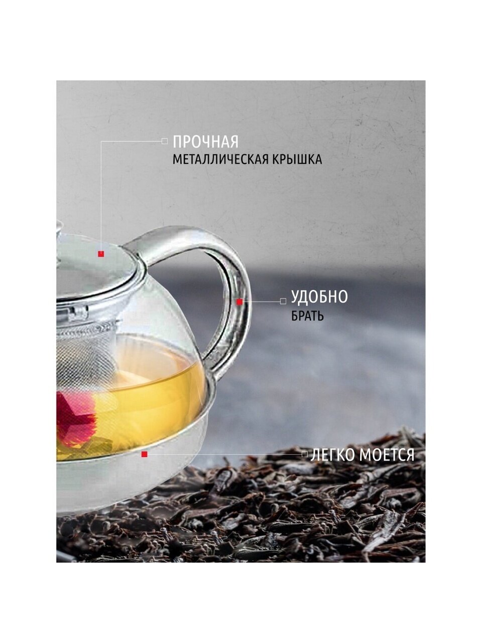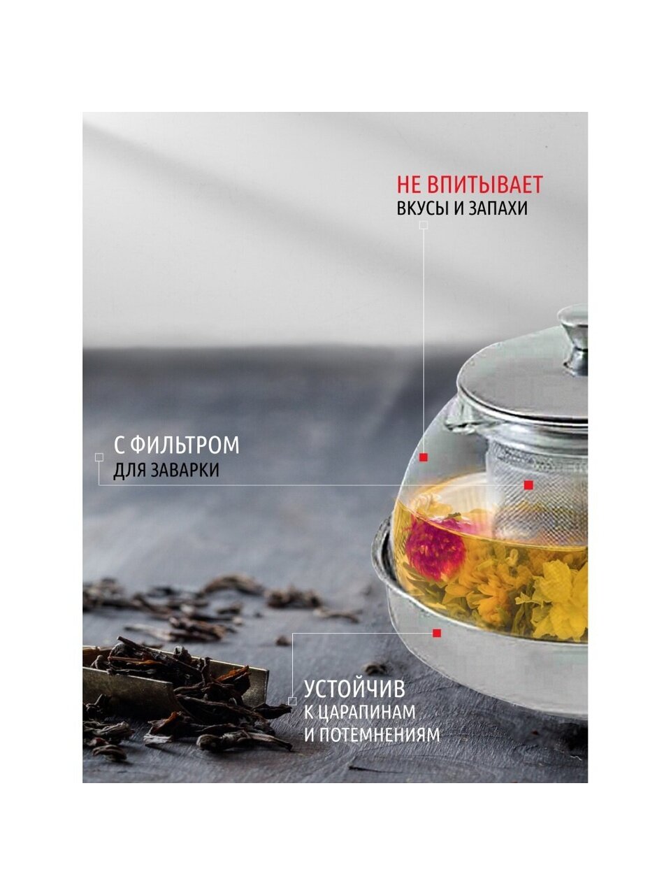 Чайник заварочный предназначен для заваривания чая и других горячих напитков. Чайник имеет стильный и лаконичный дизайн и будет выигрышно смотреться на современной кухне, а напиток в прозрачной колбе будет выглядеть привлекательно, украшая сервировку стола.