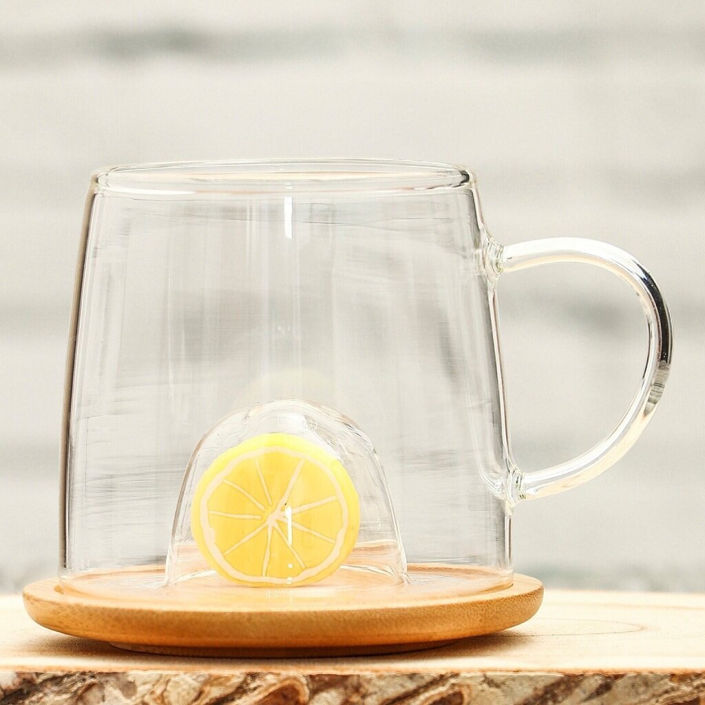 На дне кружки - углубление, созданное, чтобы бамбуковую крышку с фигуркой можно было использовать как блюдце. Фигурка точно вписывается в углубление и будто бы «плавает» в чашке, красиво просвечивая сквозь стекло.