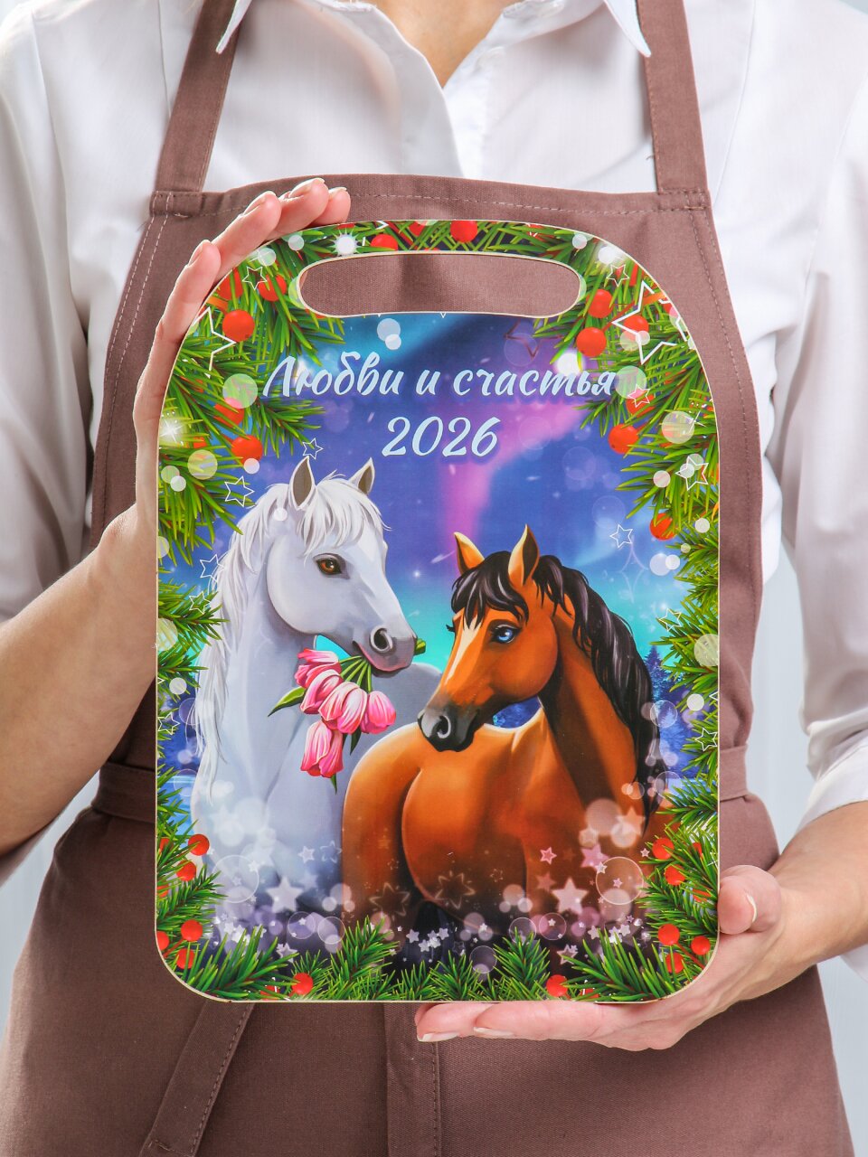 Доска разделочная дерево 29х21 см с ручкой и новогодним рисунком — стильный аксессуар для кухни, идеальный подарок к 2026 году. Удобный размер, натуральное дерево, универсальность использования.