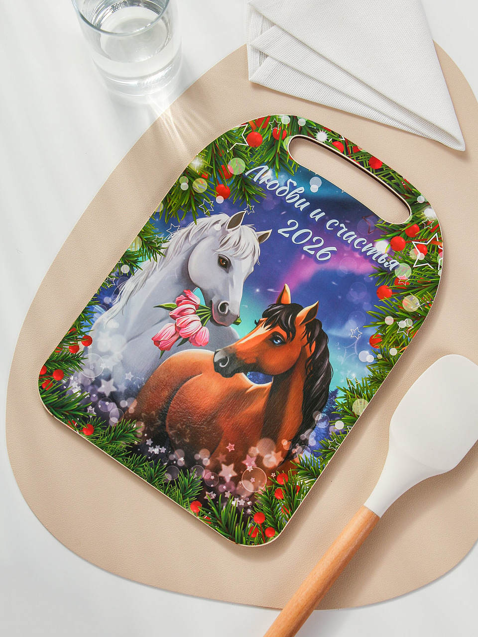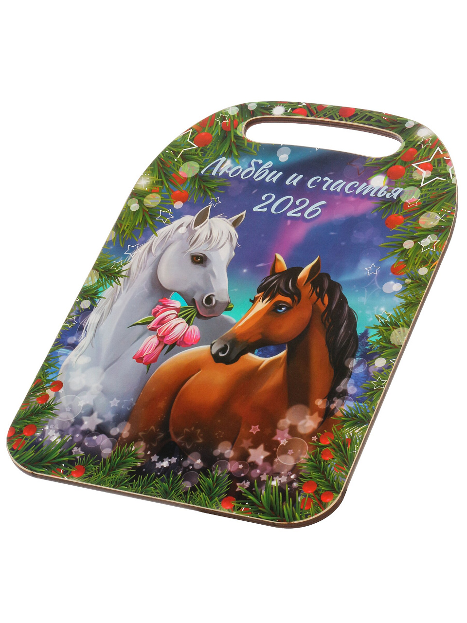 Если вы ищете, какую доску купить для дачи или как выбрать универсальную разделочную доску для кухни — обратите внимание на эту модель. Она прочная, долговечная, с удобной ручкой и подвесом. Отличается от двухсторонних моделей тем, что имеет одну рабочую поверхность с праздничным декором.