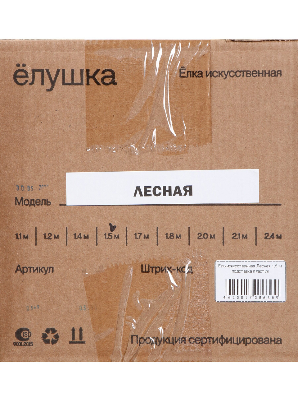 Высота — 150 см, классическая форма ели, цвет хвои — насыщенно-зеленый, тип конструкции — разборная, подставка пластиковая, модель «Лесная», бренд «Елушка».
