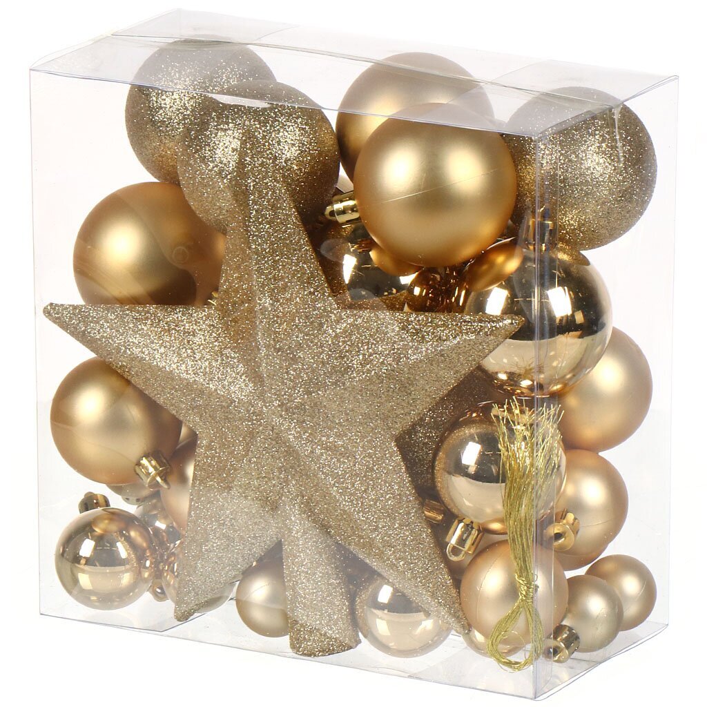 В комплекте 48 пластиковых украшений среднего размера (шары и верхушки), все элементы с подвесками, цвет — золото.