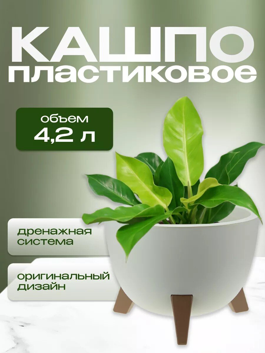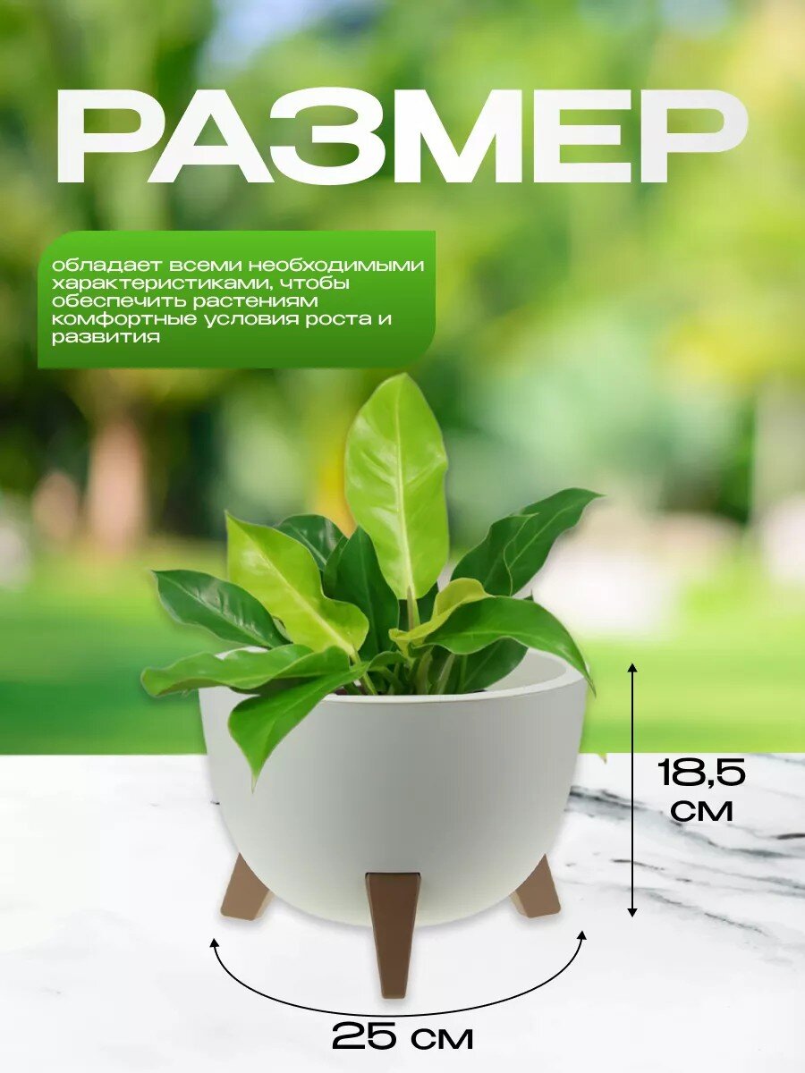 Кашпо со вставкой на ножках имеет круглую форму и матовую поверхность.