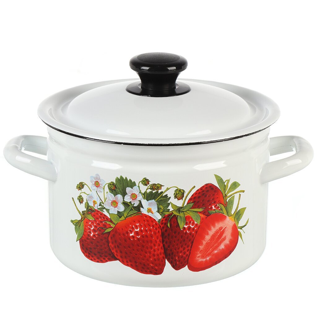 Как использовать кастрюлю без антипригарного покрытия? Просто следите за температурой и используйте деревянные или силиконовые ложки — эмаль устойчива к износу, но не любит металлических аксессуаров. Эта кастрюля — отличный выбор для дачи, дома, а яркий клубничный декор станет украшением любой кухни.