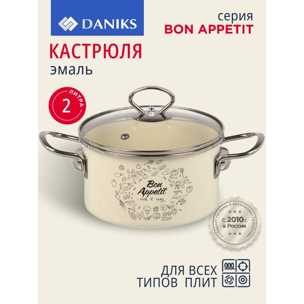 Кастрюля Daniks Bon Appetit 2 л: идеальный выбор для индукционных плит, безопасное стекло, долговечная эмаль — готовьте любимые блюда легко и удобно.