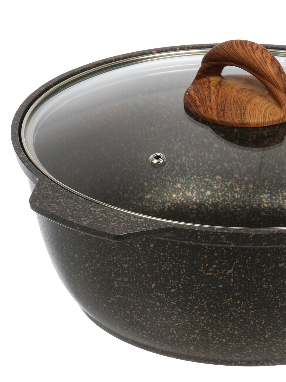 Универсальность: подходит для любых плит и духовки (без крышки), прочный литой алюминий, антипригарное покрытие, стеклянная крышка, удобно мыть в посудомоечной машине — отличный выбор для дачи, подарка или домашней кухни.