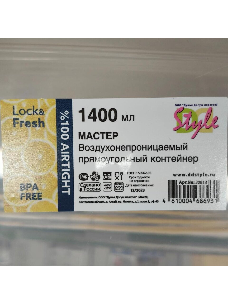 Объём — 1.4 литра, форма — прямоугольная. Подходит для хранения порционных блюд, овощей, фруктов, полуфабрикатов.