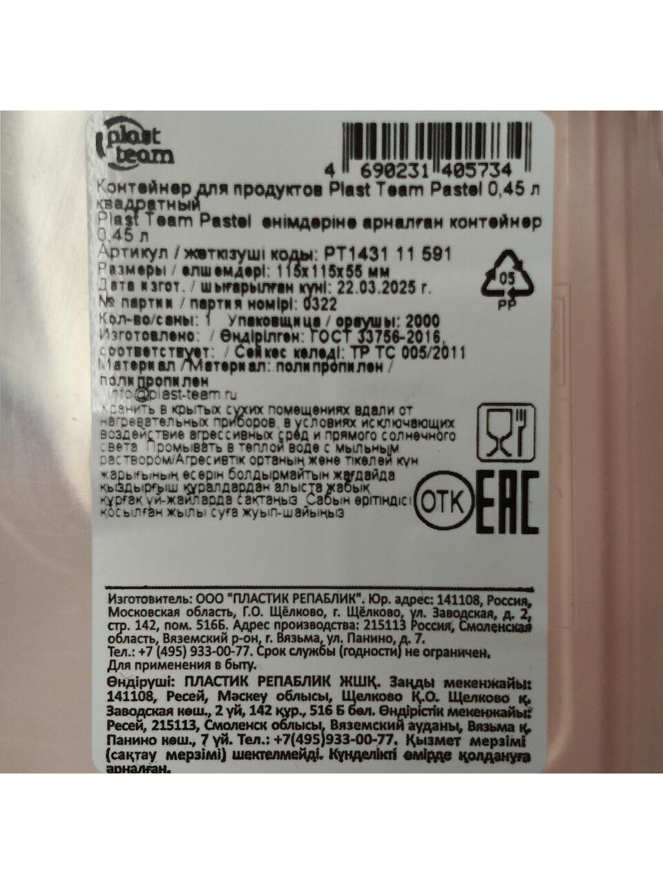 Контейнер пищевой Plast team Pastel объёмом 0.45 л — это практичный выбор для тех, кто ищет недорогой контейнер для еды на каждый день. Его квадратная форма и компактные размеры позволяют удобно разместить его в холодильнике, сумке или рюкзаке. Плотная крышка защищает содержимое от протекания, а пищевой пластик не впитывает запахи и легко очищается в посудомоечной машине.