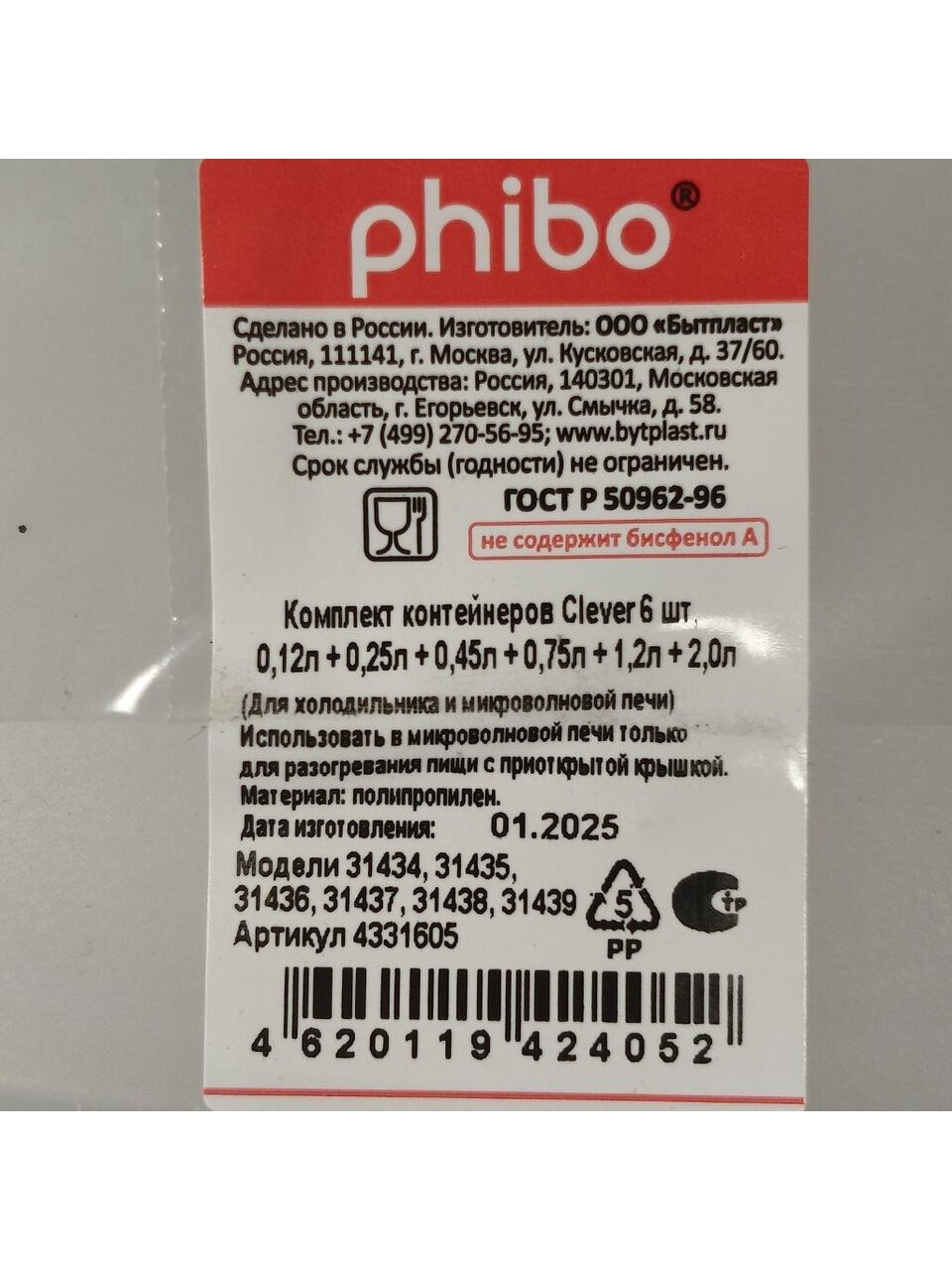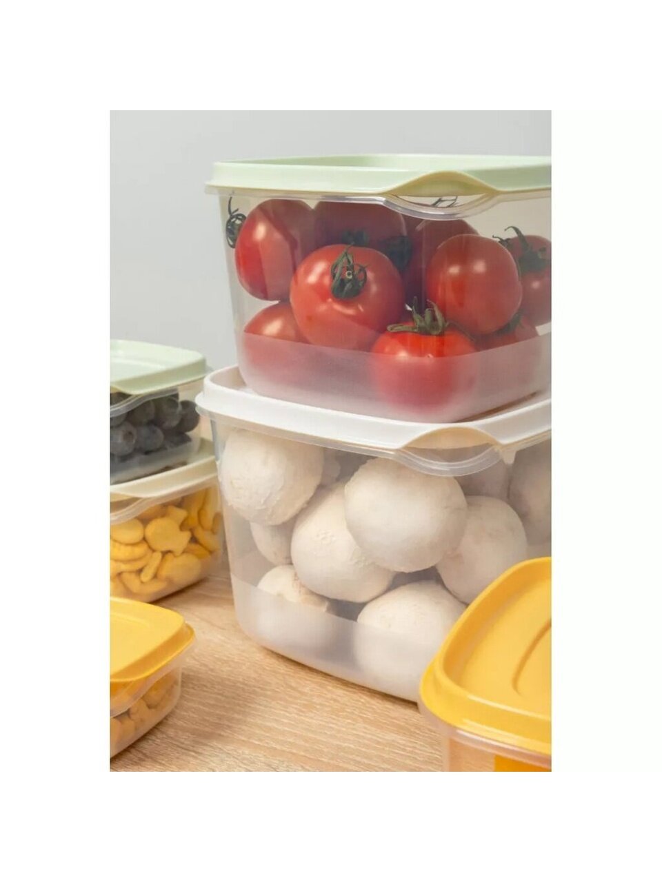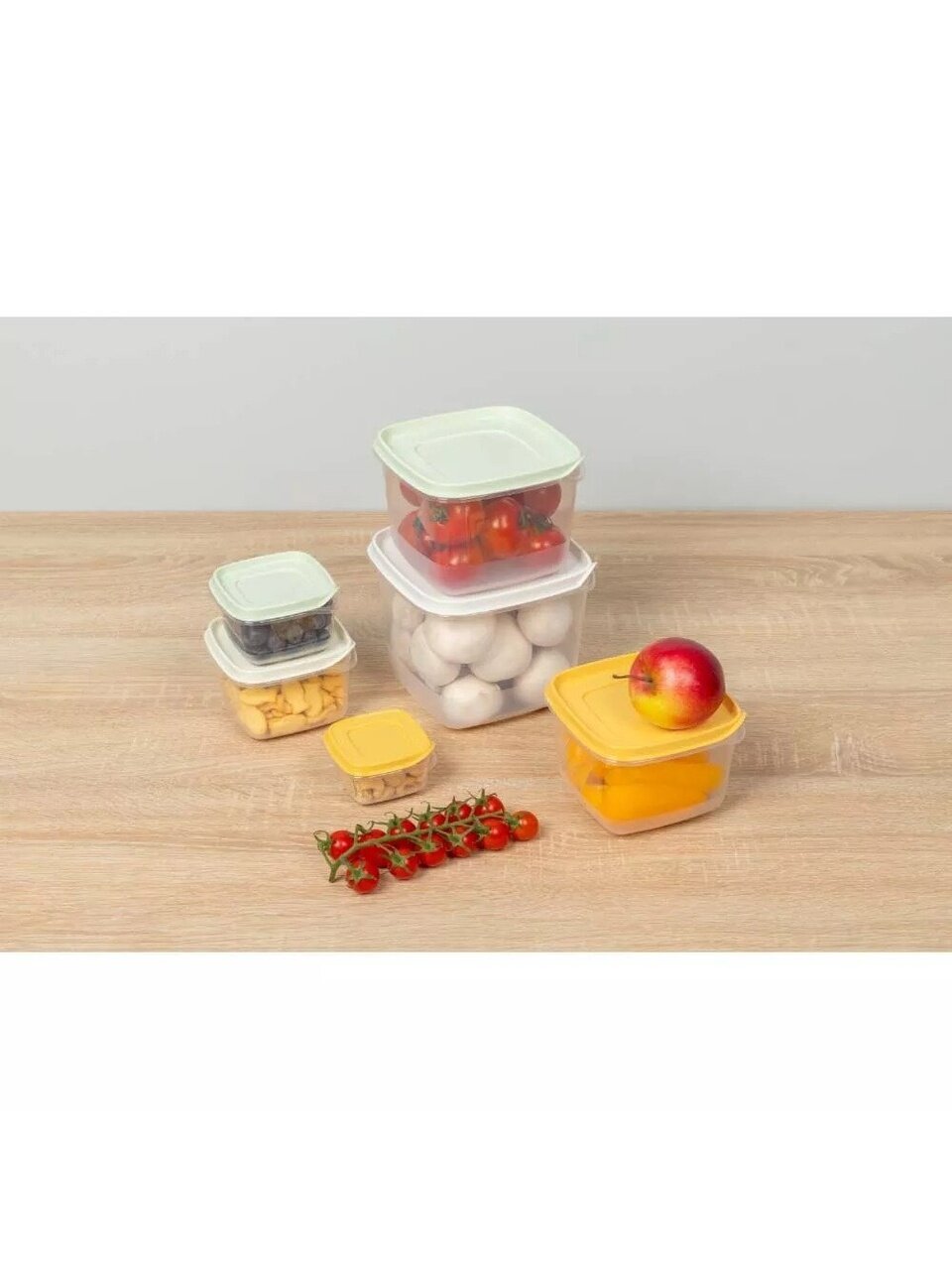 В наборе 6 контейнеров объёмом 0.12, 0.25, 0.45, 0.75, 1.2 и 2 литра — оптимальный выбор для хранения любых продуктов.