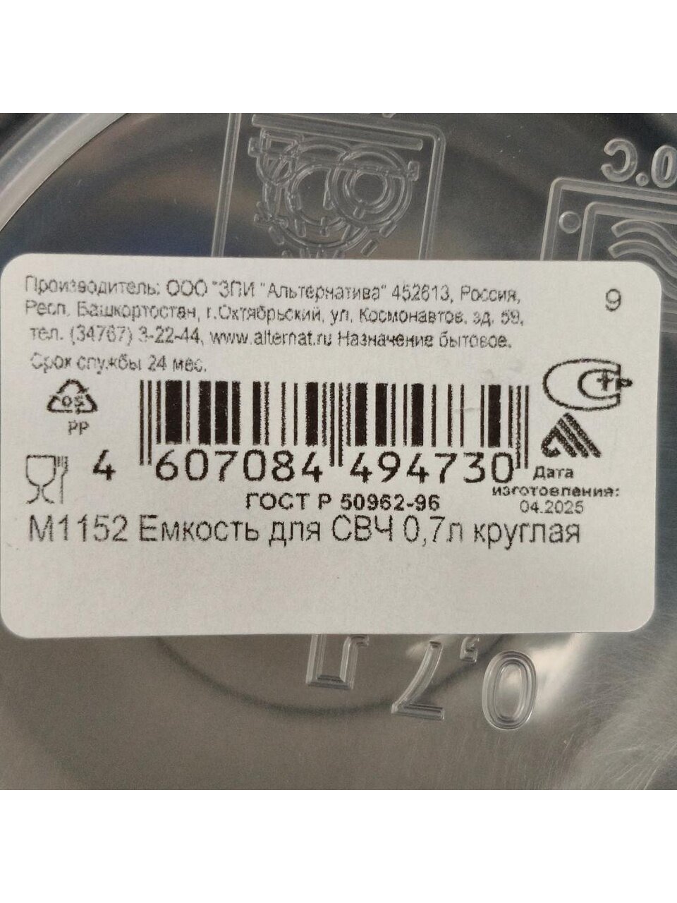 Контейнер круглый, объём 0.7 литра, размеры: 12×12×9 см. В комплекте одна штука, цвет — в ассортименте.