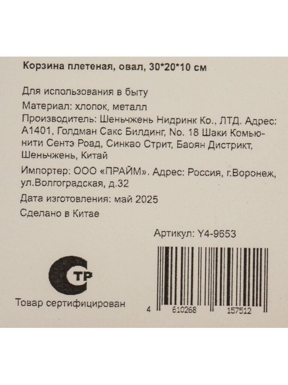 Овальная плетёная корзина (размеры 30х20х10 см) — это универсальный аксессуар для хранения и декора. Благодаря натуральному хлопку и прочному металлическому каркасу изделие сохраняет форму, не деформируется и легко переносится благодаря эргономичным ручкам. Корзина не содержит ротанга, что делает её лёгкой и устойчивой к износу, а бежевый цвет гармонично впишется в любой стиль — от сканди до прованса.