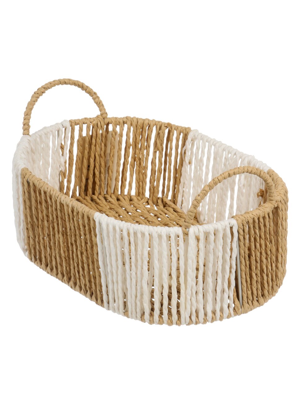 Размеры корзины: ширина 30 см, глубина 20 см, высота 10 см; форма овальная, есть ручки для переноски, крышка не предусмотрена, складная конструкция отсутствует.