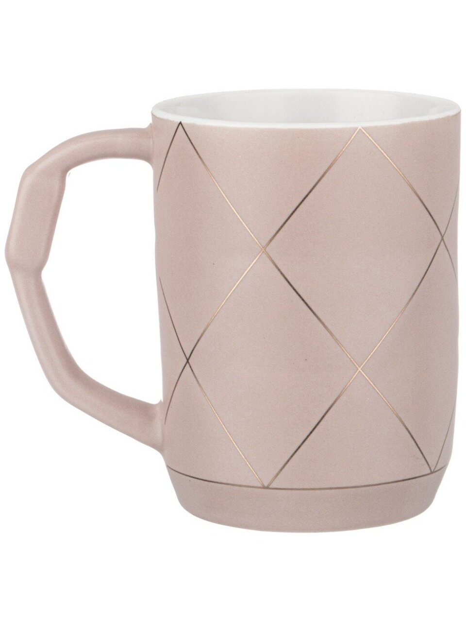 Кружка выполнена из фарфора, объём составляет 380 мл (округленно — 400 мл), вес — 378 г. Цвет — розовый, дизайн — однотонный с надписью и полосами.