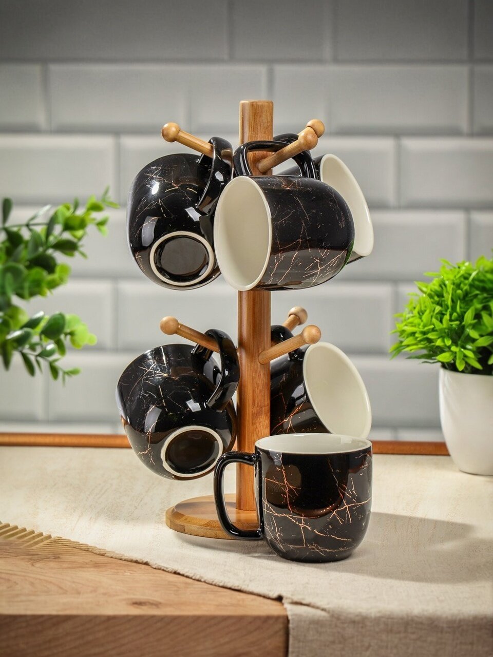 - Удобная и прочная подставка в комплекте. На ней Вы сможете разместить кружки прямо на рабочей поверхности, сделав из набора самостоятельный элемент декора кухни.