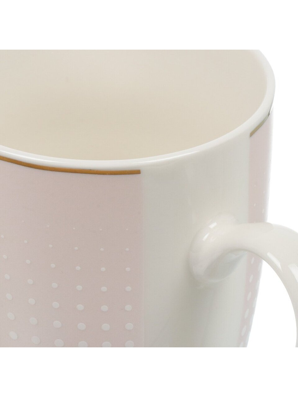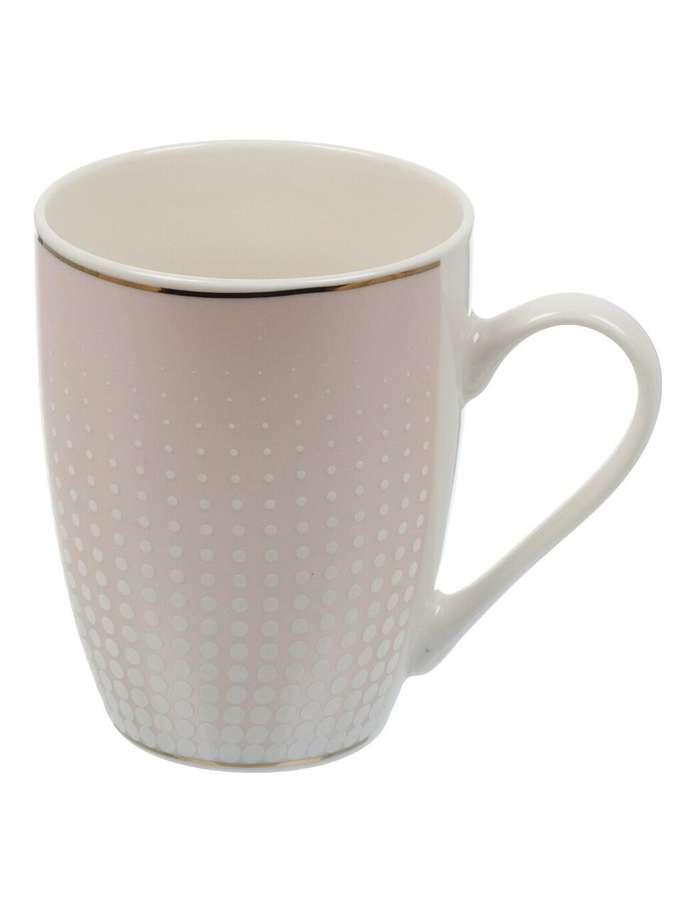 Объём кружки — 340 мл (округлённо 350 мл), материал — фарфор, без дополнительных аксессуаров, цвет — розовый, дизайн — горошек.
