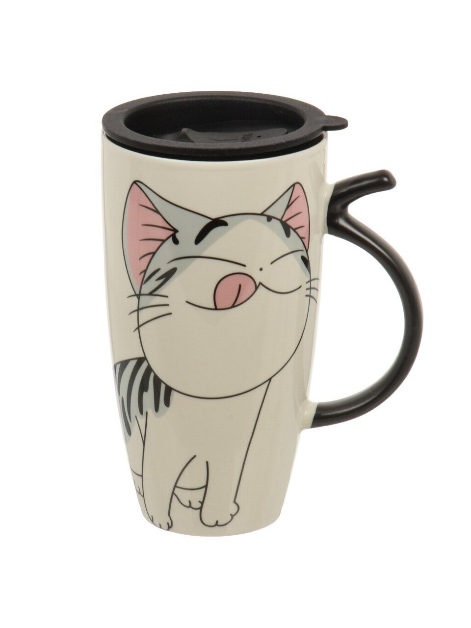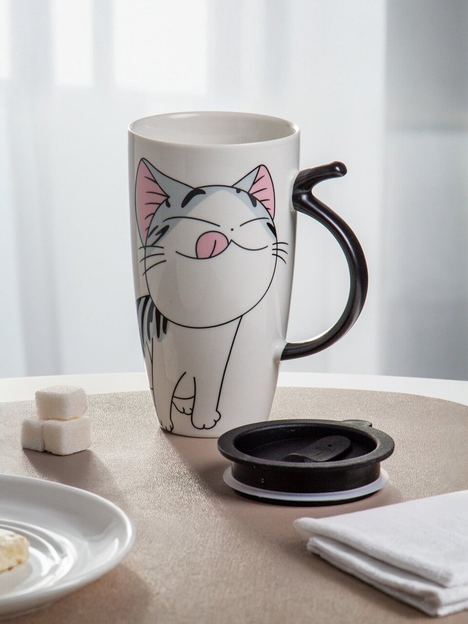 Большая керамическая кружка 640 мл с крышкой и дизайном «Кошка» — практичный подарок для женщин, чтобы пить чай или кофе дома и на работе без проливаний.
