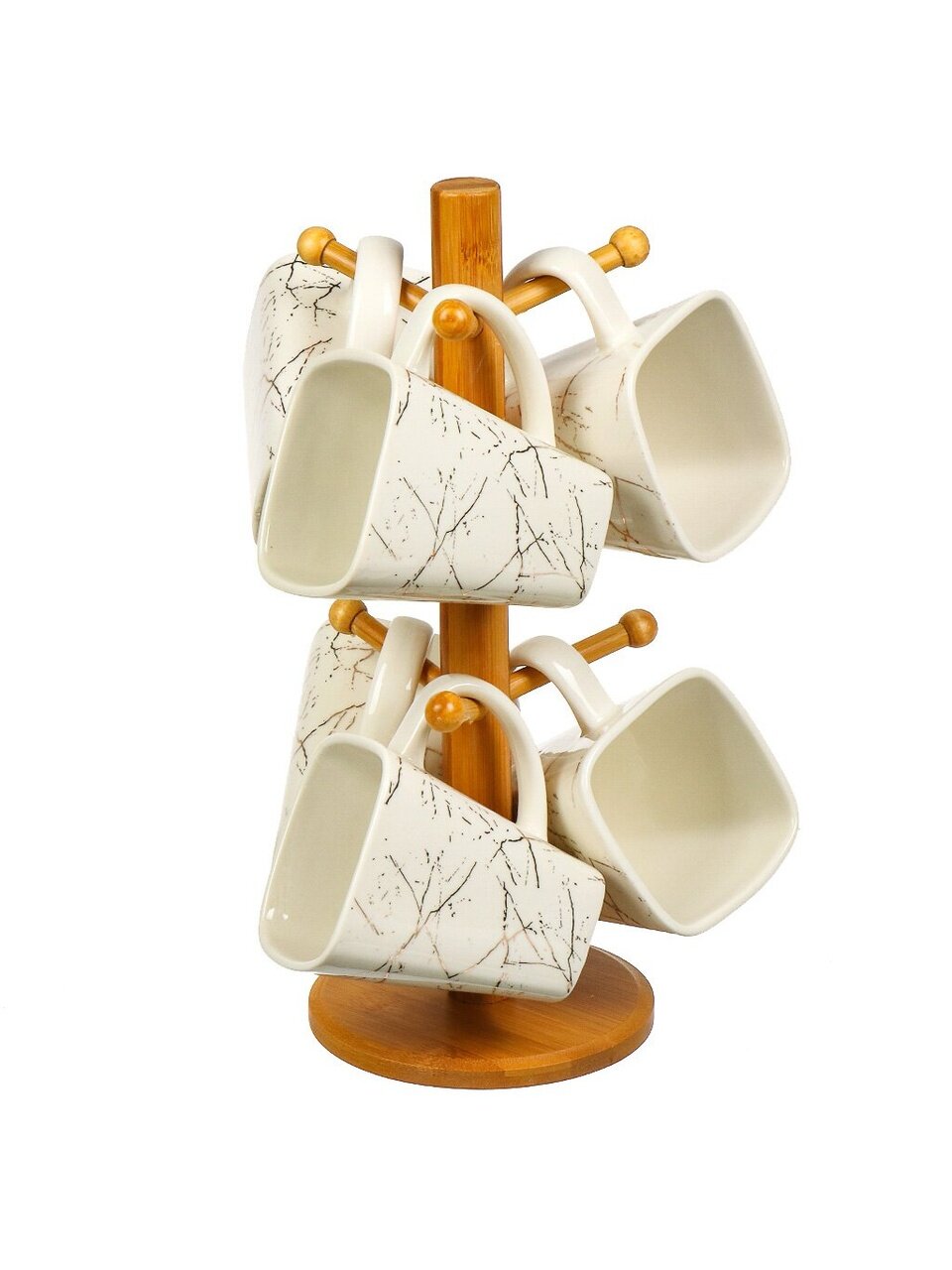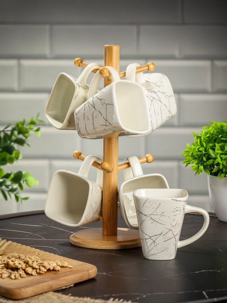 Набор керамических кружек 310 мл (6 шт) с бамбуковой подставкой: элегантный белый мрамор с золотом для стильного чаепития дома и в подарок