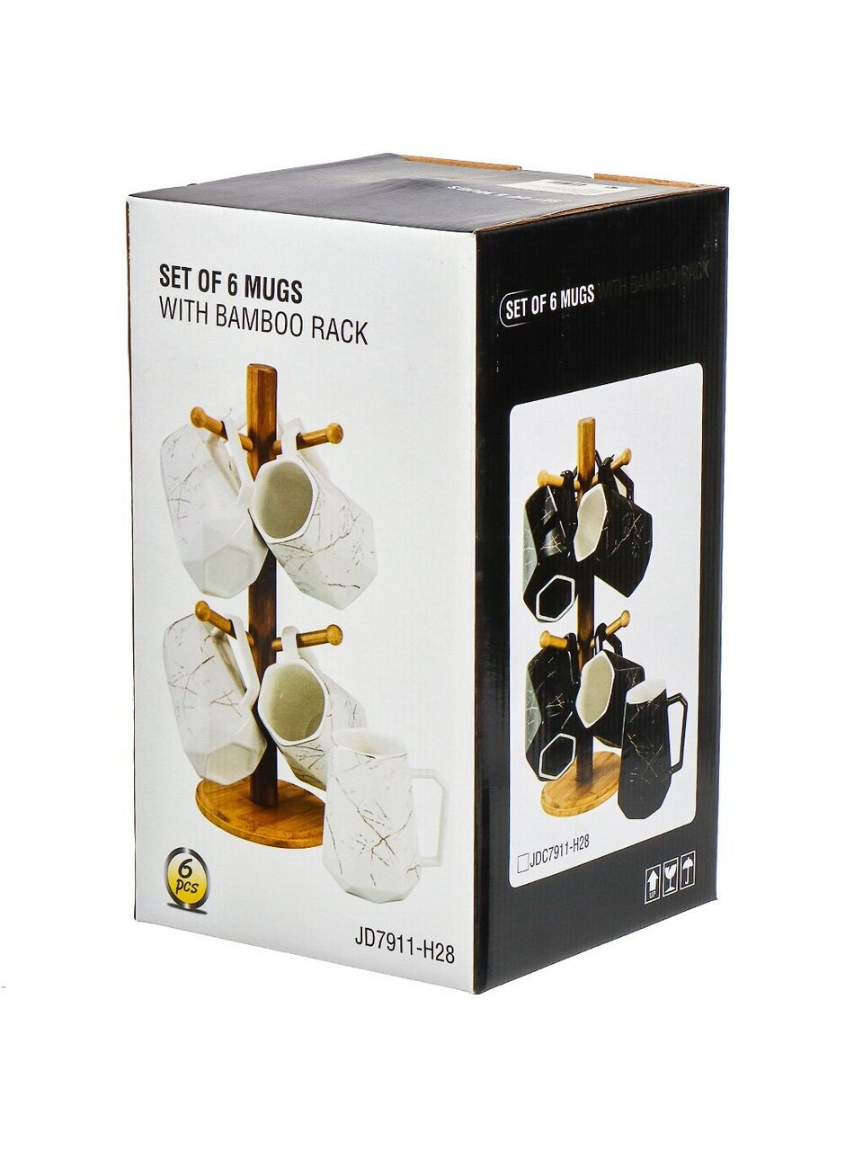 Общий вес — 2340 г, в комплекте 6 кружек по 310 мл, бамбуковая подставка, подарочная упаковка. Цвет — белый мрамор с золотом.