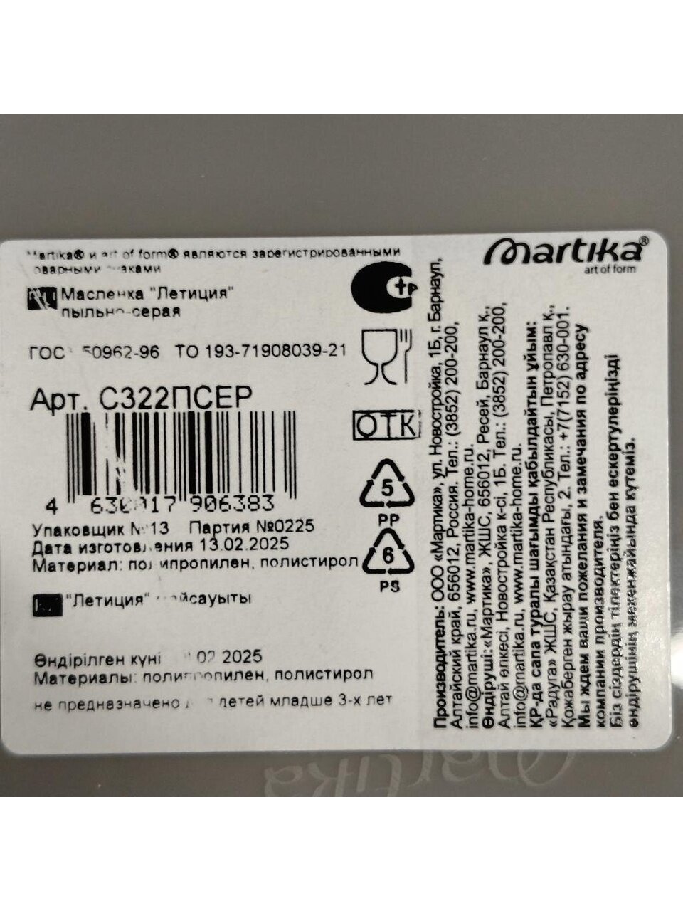 Вы можете приобрести «Масленка пластик, пыльно-серая, Martika, Летиция, С322ПСЕР» и другие товары в нашем интернет-магазине в Казани по низким ценам и с бесплатным самовывозом.
