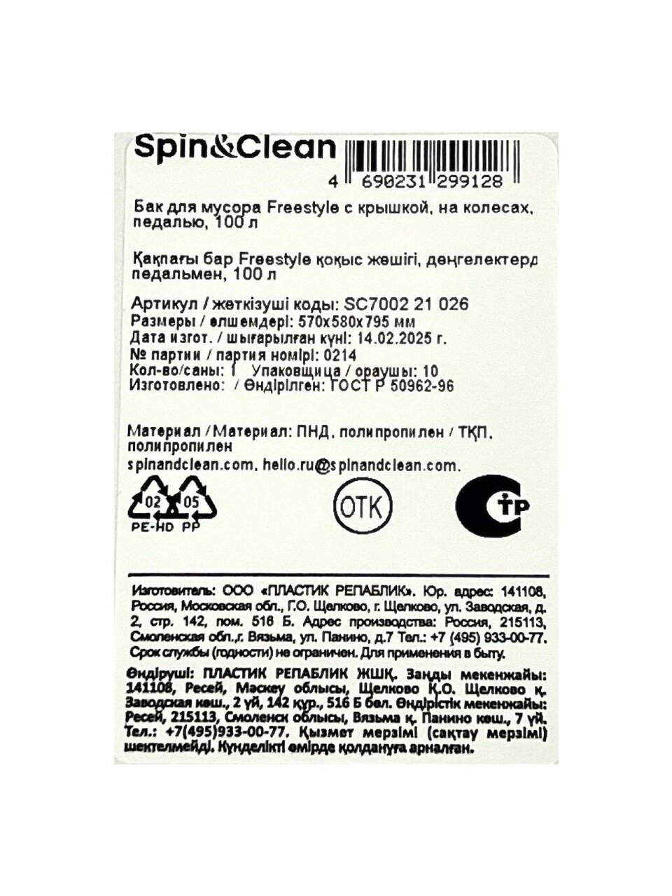 Вы можете приобрести «Контейнер для мусора пластик, 100 л, прямоугольный, с крышкой, на колесах, педаль, Spin&Clean, Freestyle, SC700221026» и другие товары в нашем интернет-магазине в Казани по низким ценам и с бесплатным самовывозом.