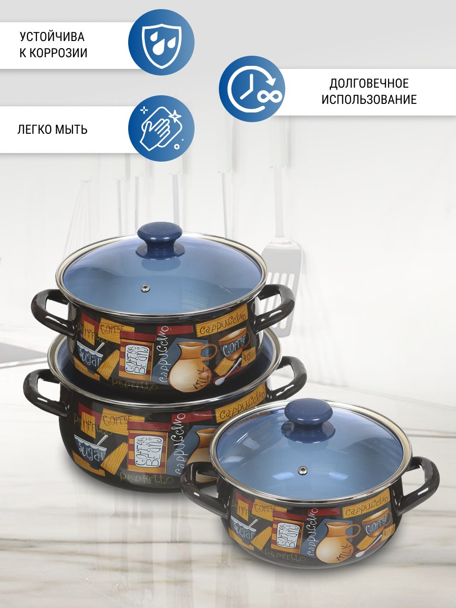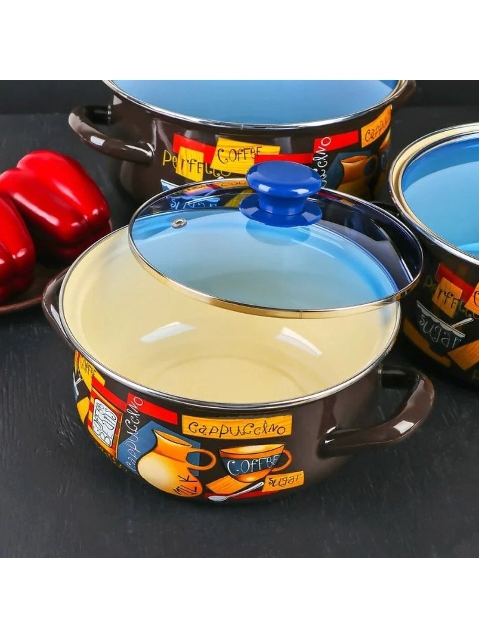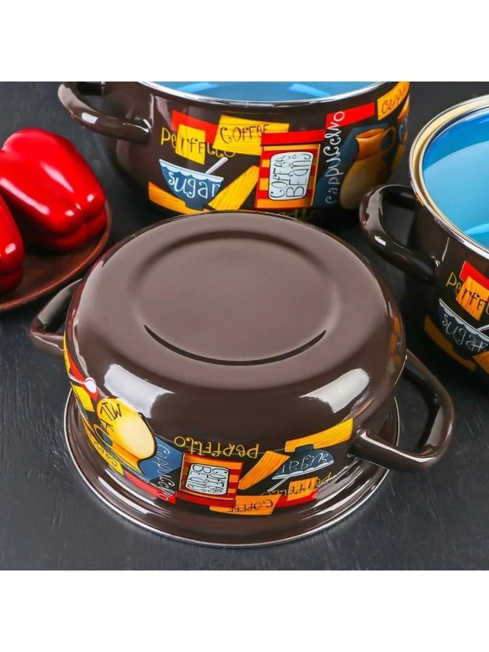 Набор эмалированной посуды 6 предметов «Капучино-Экстра» — оптимальное решение для дома и дачи: 3 кастрюли 2/3/4 л, долговечность, стиль и безопасность.