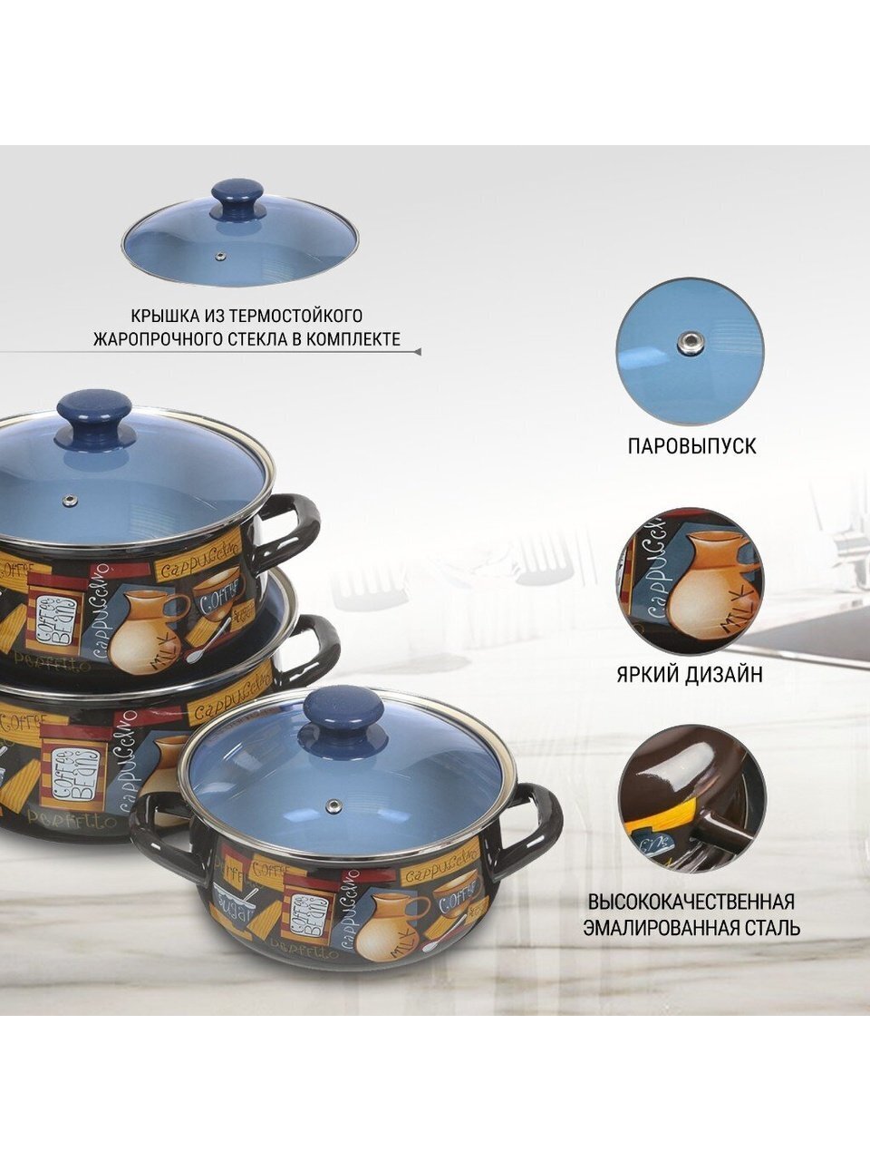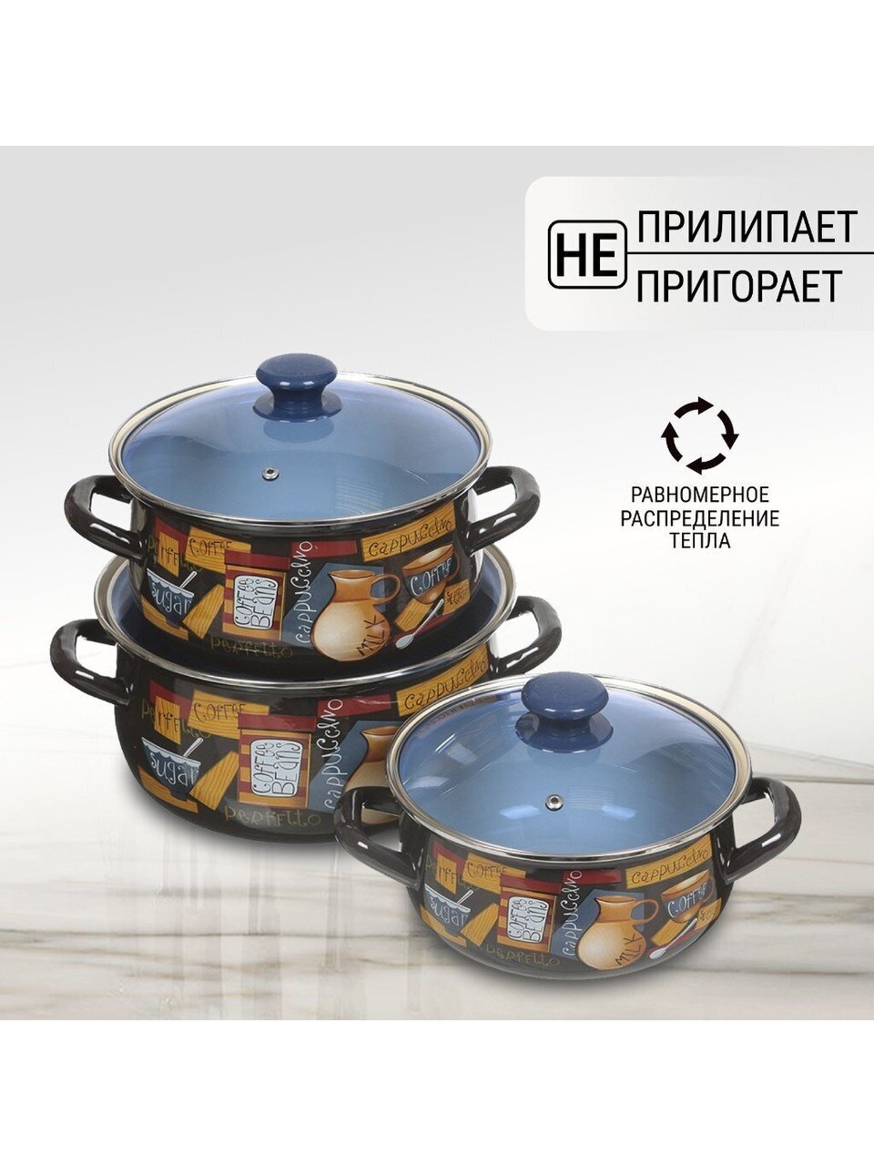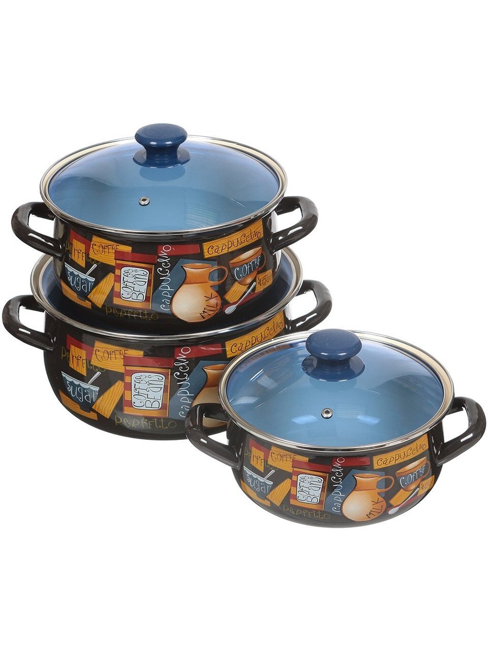 Набор эмалированной посуды 6 предметов «Капучино-Экстра» — оптимальное решение для дома и дачи: 3 кастрюли 2/3/4 л, долговечность, стиль и безопасность.