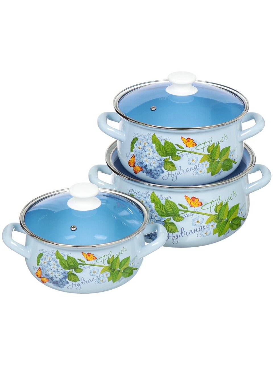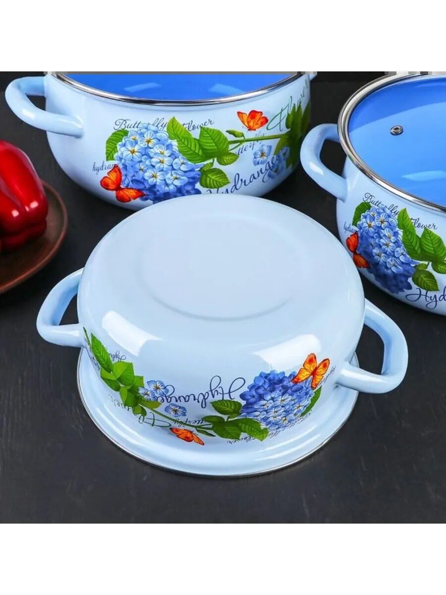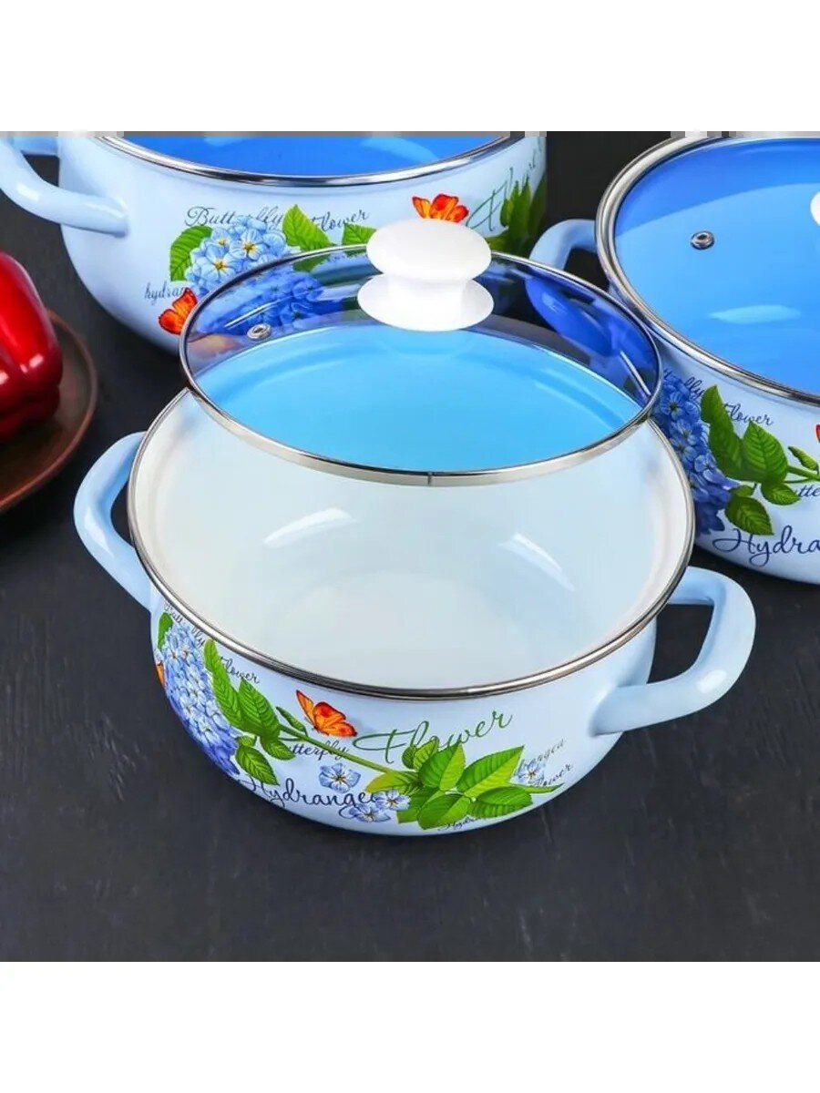 Набор эмалированной посуды 6 предметов Гортензия-Экстра: три кастрюли 2/3/4 л и стеклянные крышки для удобства дома и дачи по доступной цене.