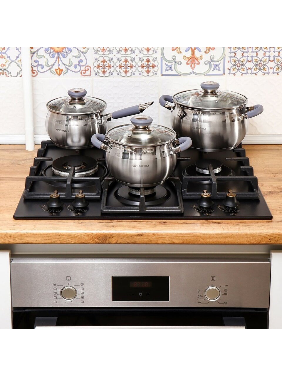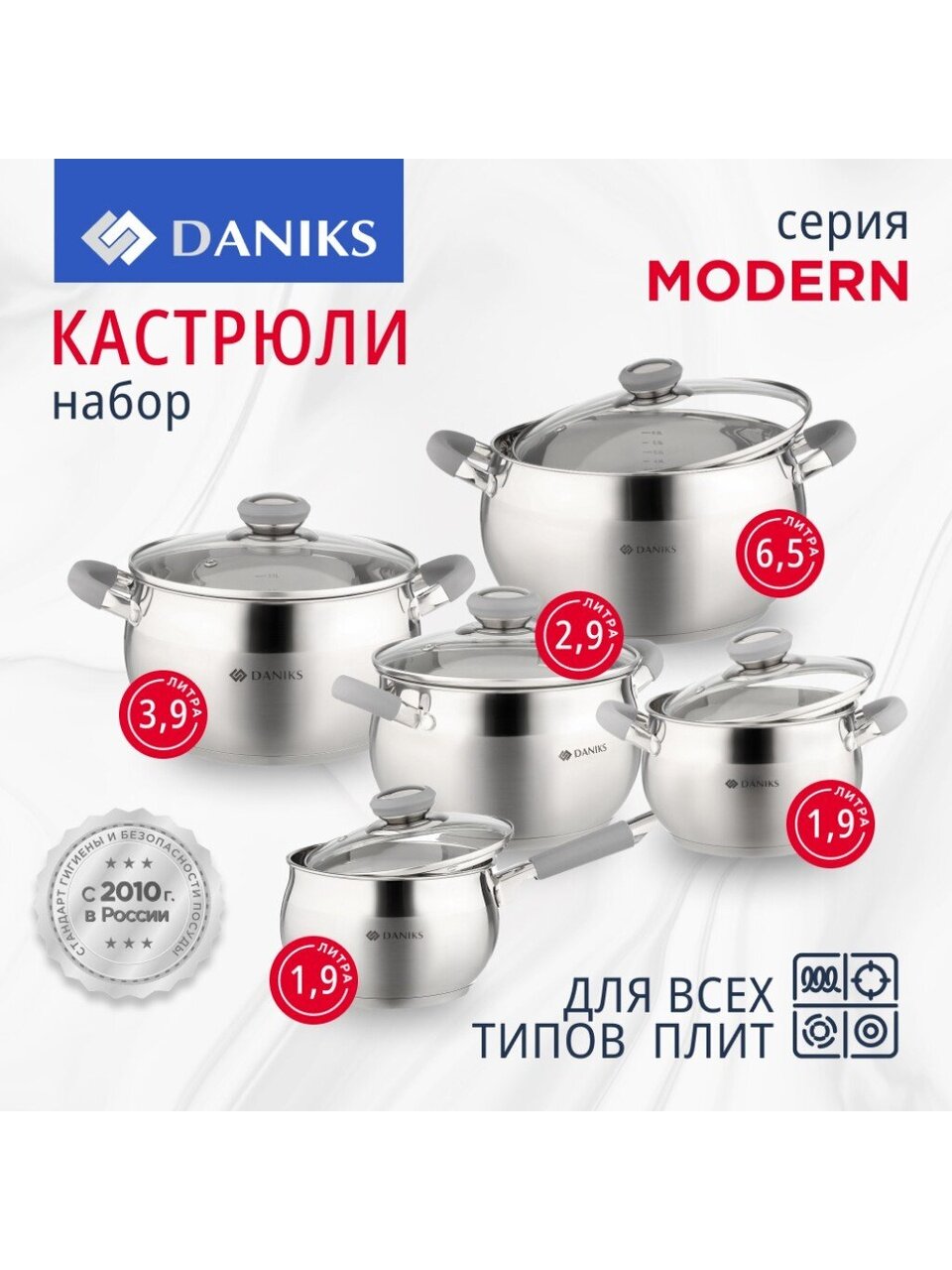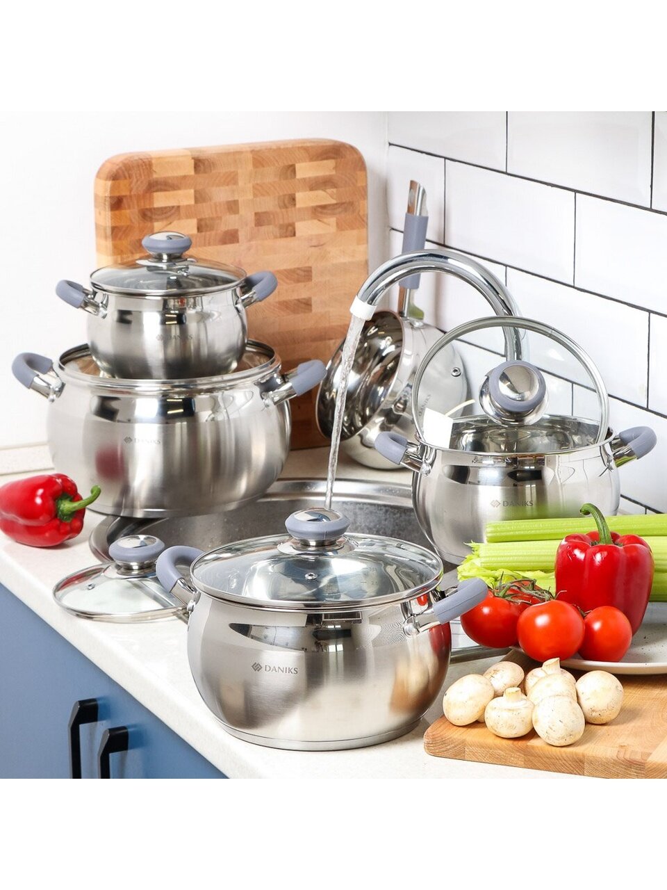 Как выбрать набор посуды для индукционной плиты? Daniks Модерн серый — это продуманный комплект из 10 предметов, где каждая кастрюля и ковш выполнены из прочной нержавеющей стали. Стеклянные крышки позволяют наблюдать за процессом готовки, а эргономичные ручки обеспечивают комфортное использование. Благодаря отсутствию антипригарного покрытия, посуда подходит для любителей классической кулинарии и легко очищается даже после активной эксплуатации.