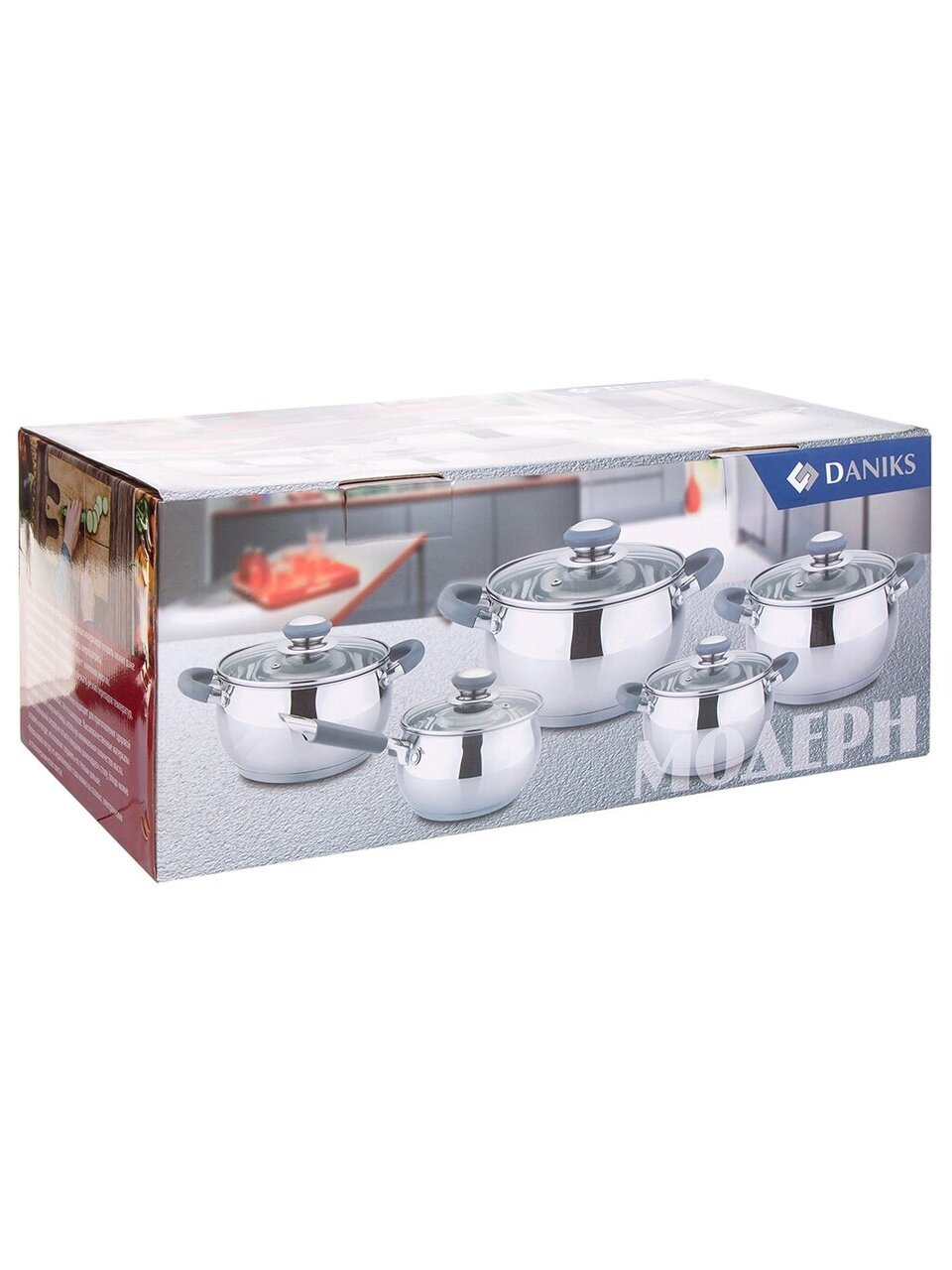Набор посуды Daniks Модерн серый: 10 предметов из нержавеющей стали для индукции, идеальное решение для кухни, дачи и подарка.