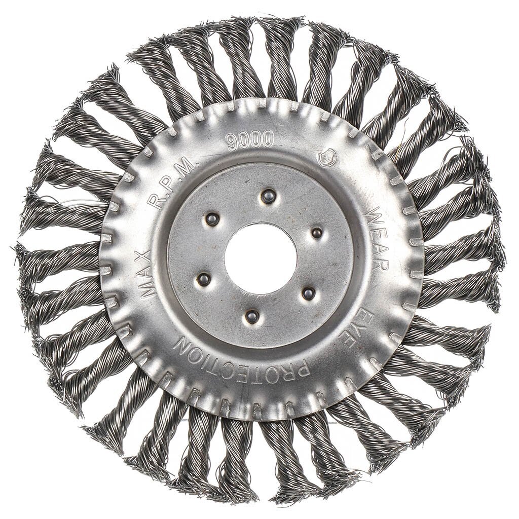 Щетка для УШМ - сменная дисковая (из крученой проволоки) насадка, изготовленная из стали. Предназначена для отделки металлических поверхностей - с помощью щетки можно удалить следы лака, краски, ржавчины и других загрязнений, очистить сварные швы от шлака и окалины.