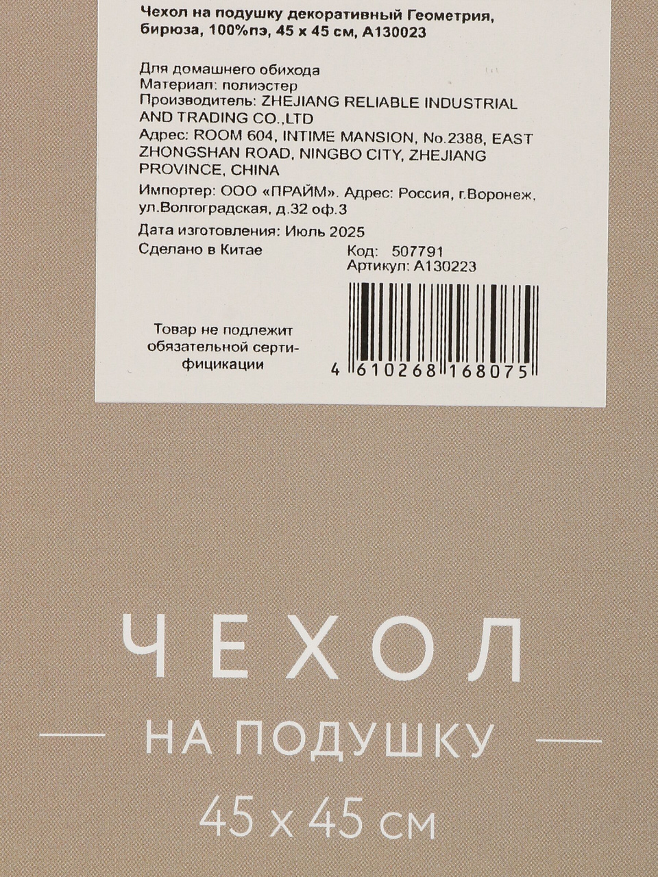 Наволочка «Геометрия» в бирюзовом оттенке — это быстрый способ добавить интерьеру свежести и индивидуальности. Благодаря универсальному размеру 45×45 см она подходит для большинства стандартных подушек. Ткань из 100% полиэстера устойчива к выцветанию, не требует сложного ухода и сохраняет форму даже при частой стирке. Молния скрыта, что делает использование максимально удобным и безопасным для мебели.