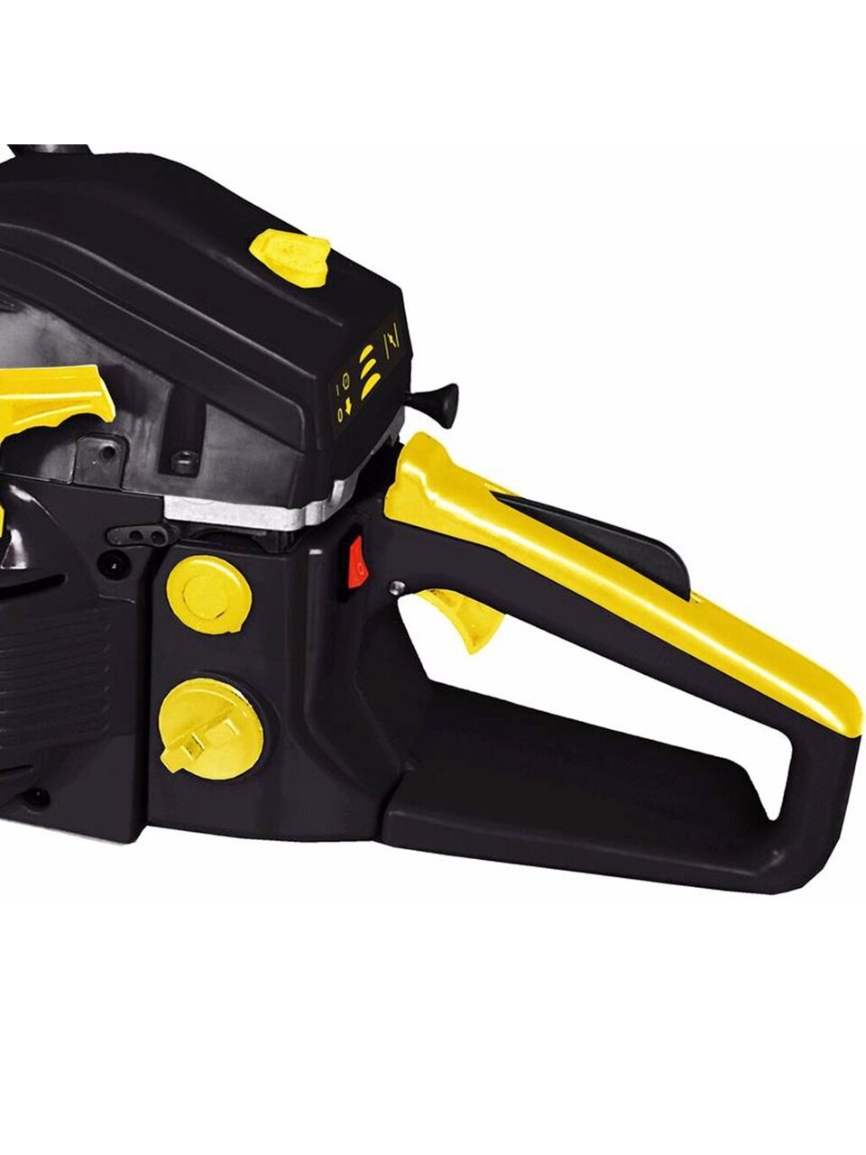 Инструмент может использоваться для продольной и поперечной распиловки древесины. Он относится к разряду пил, предназначенных только для бытового применения. Топливный бак, рассчитанный на 0,55 л, позволяет работать без дозаправки достаточное количество времени. Удобная рукоять хорошо фиксируется в руке, что позволяет крепко удерживать инструмент при работе. Это необходимо, несмотря на ее небольшой вес. Специальный щиток защитит руку в случае обрыва цепи. Органы управления агрегатом расположены на задней рукояти и позволяют регулировать процесс, не снимая руки.