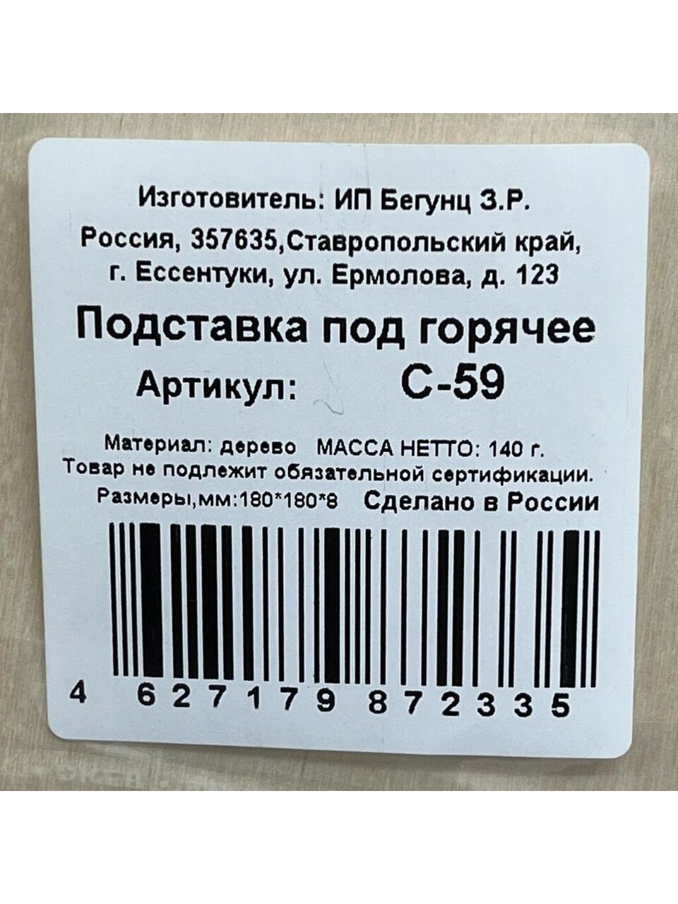 Вы можете приобрести «Подставка под горячее, дерево, 18 см, С-59» и другие товары в нашем интернет-магазине в Железногорске по низким ценам и с бесплатным самовывозом.