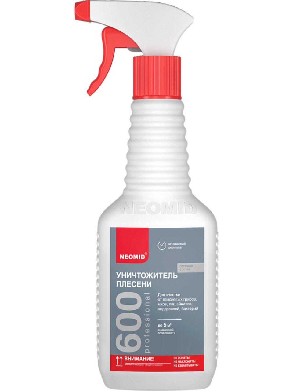 Neomid 600 – готовый раствор для удаления плесени, полученный путем разведения водой в соотношении 1:1. Перед применением поверхности, не требующие обработки, следует защитить от попадания средства.
