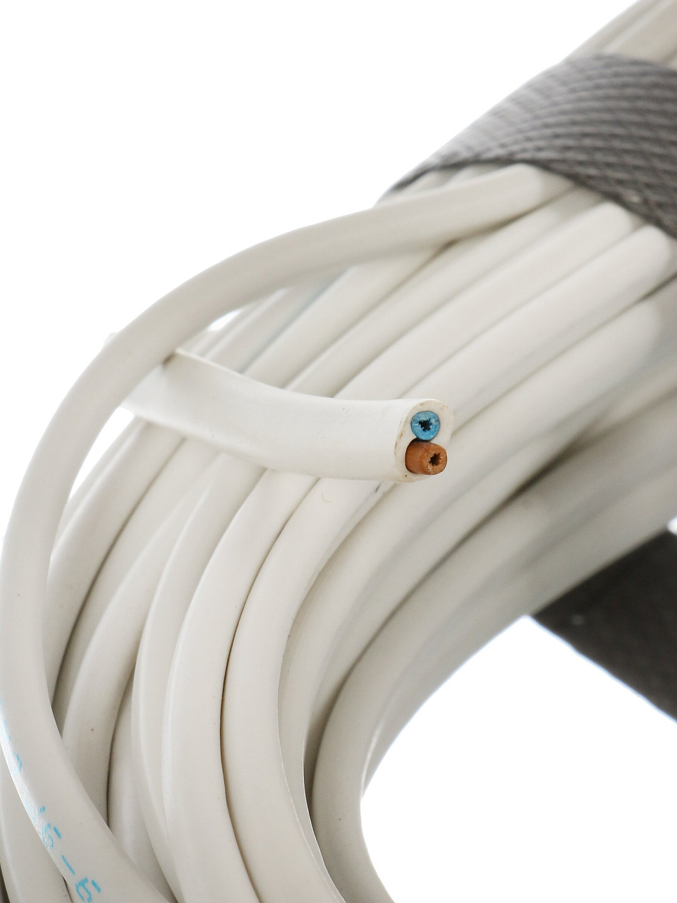 Длина — 20 метров, количество жил — 2, сечение каждой жилы — 0.5 мм², материал — медь, стандарт — ГОСТ, цвет изоляции — белый, тип — соединительный провод ШВВП.