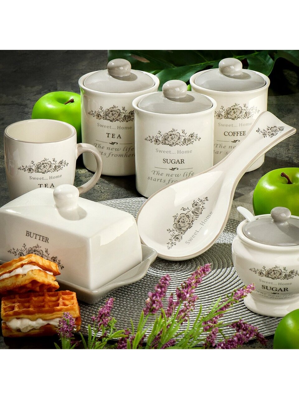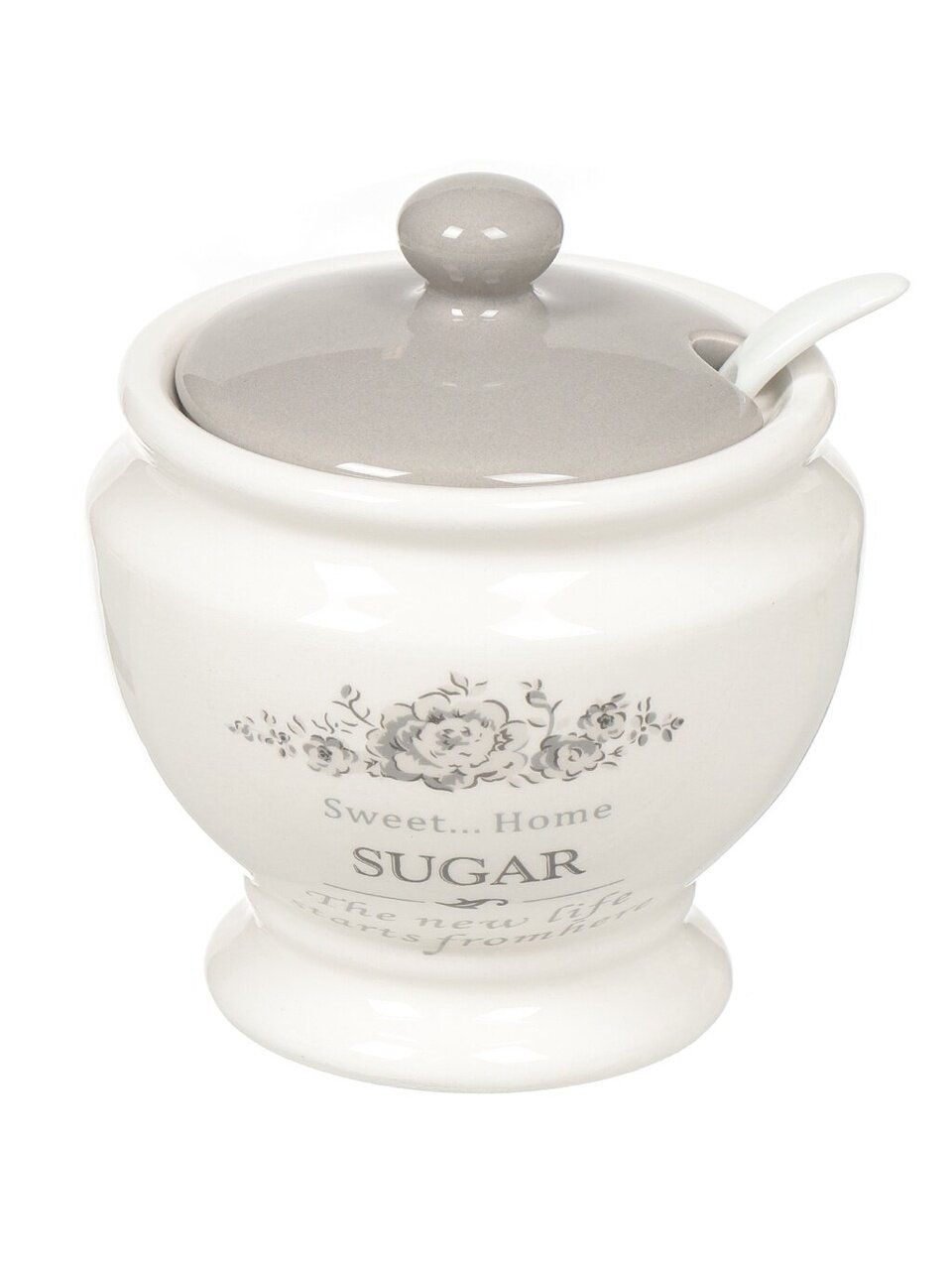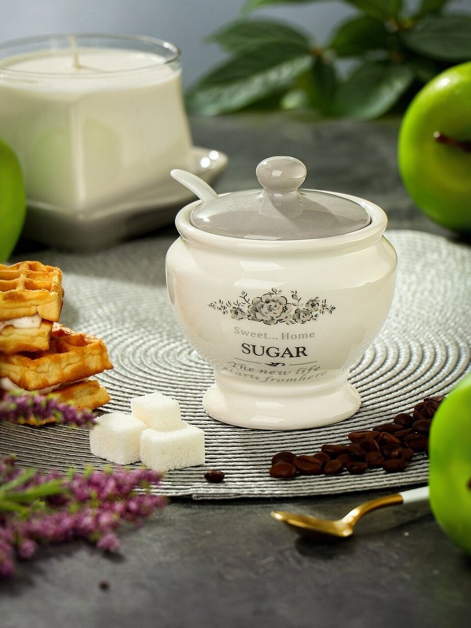 Сахарница с крышкой и ложкой станет украшением как повседневного, так и праздничного стола. Сахарницу удобно мыть, а благодаря ложке в комплекте этот предмет сервировки сразу готов к использованию. Ее можно использовать и для сервировки любых других специй, а также меда, горчицы и любых других соусов. Рисунок на сахарнице односторонний.