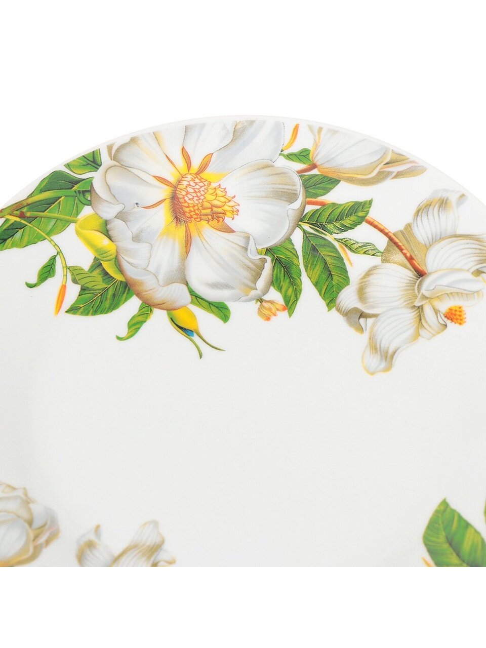 Диаметр — 20 см, высота — 5,5 см, объём — 0,9 л, форма — круглая, цвет — белый с цветочным рисунком.