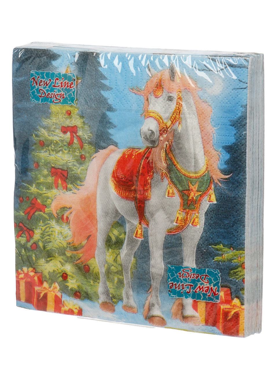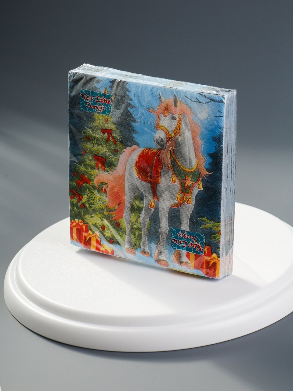 В упаковке 20 разноцветных салфеток с ярким новогодним принтом «Лошадка», что делает их отличным выбором для зимних праздников.