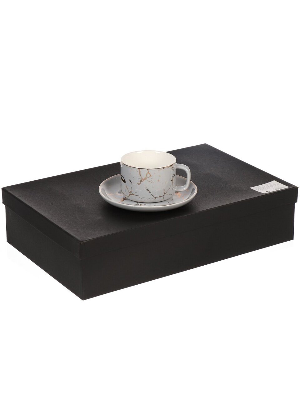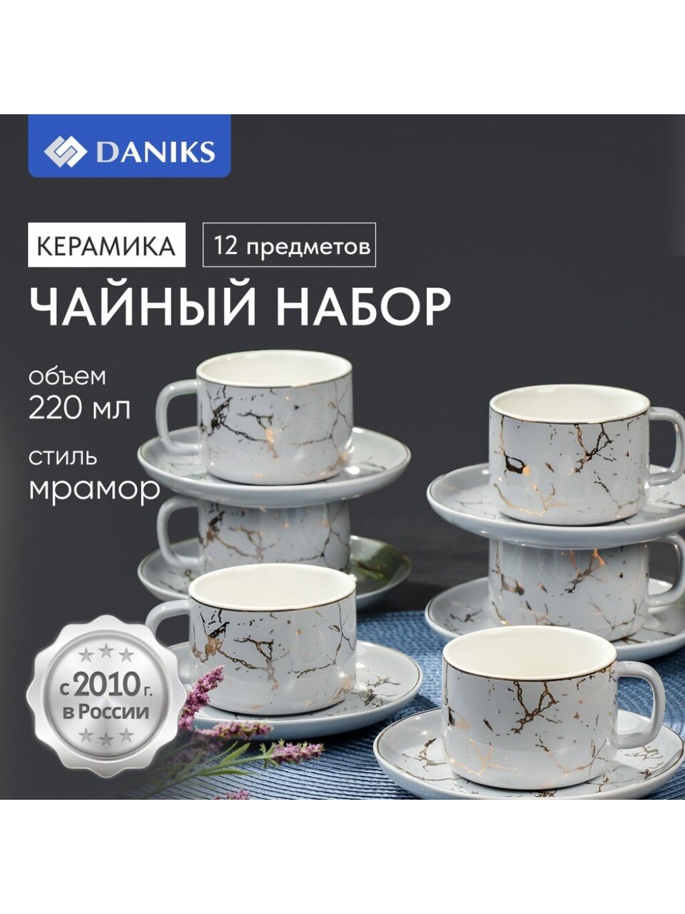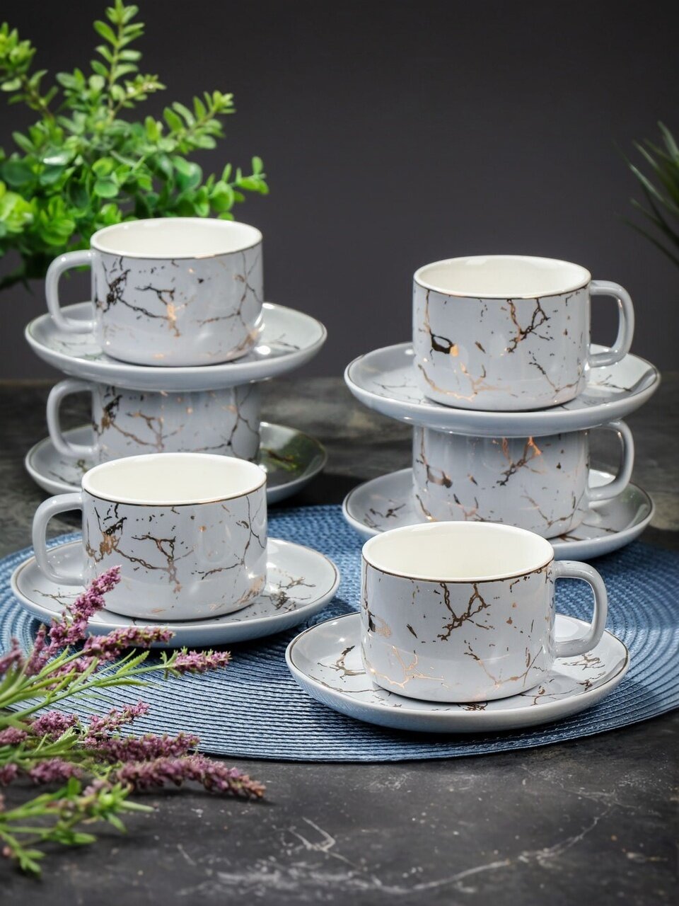 Чайный набор из керамики на 6 персон «Серый Мрамор» (12 предметов, 220 мл, подарочная упаковка): стиль для современного интерьера и идеальный подарок без лишних забот о хранении и уходе.