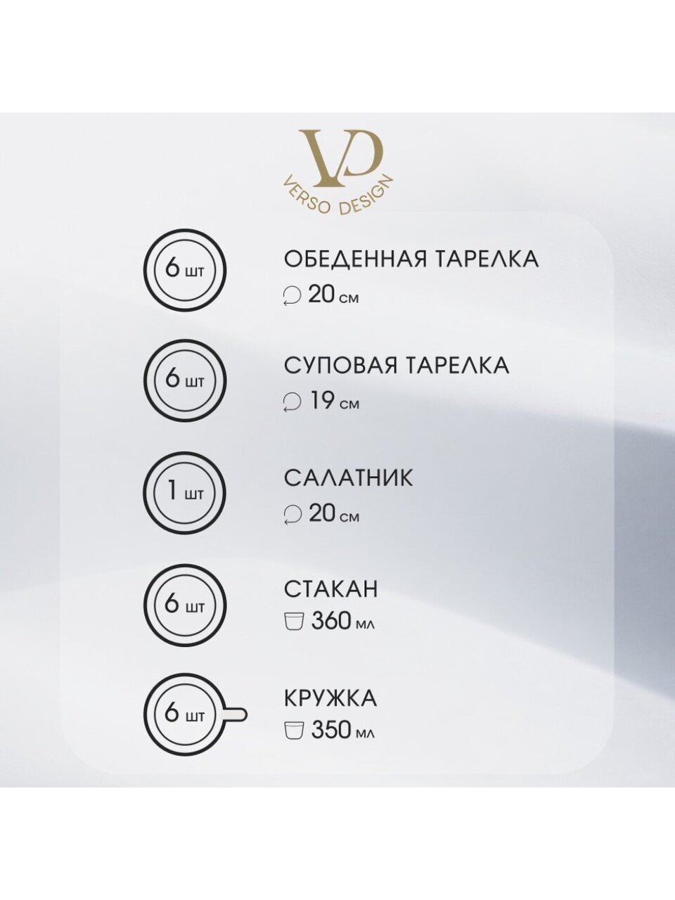 В комплекте 25 предметов, рассчитанных на 6 персон — оптимально для семейных ужинов и приёма гостей.